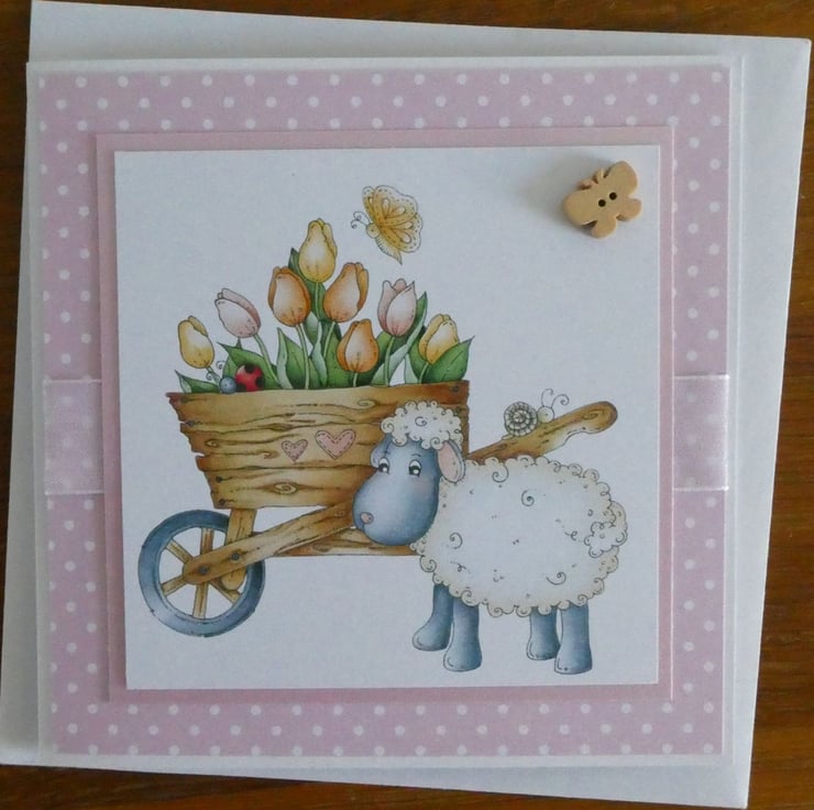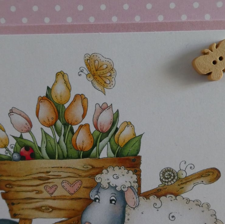 This cute card has a printed topper showing a sheep next to a wheelbarrow full of tulips with a butterfly and snail for company.