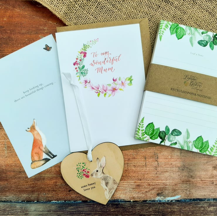 Our Personalised Treat Boxes make the perfect letterbox gift to send to your loved one to show them how much you care! This cute gift collection contains; an A6 Magnolia Wreath Card personalised for you in metallic modern calligraphy, a A6 recycled paper notepad, a sustainable birch wood heart and a order thank you card which doubles as cute A6 Print, all wrapped up in a kraft box that is the perfect size to fit through the letterbox!
