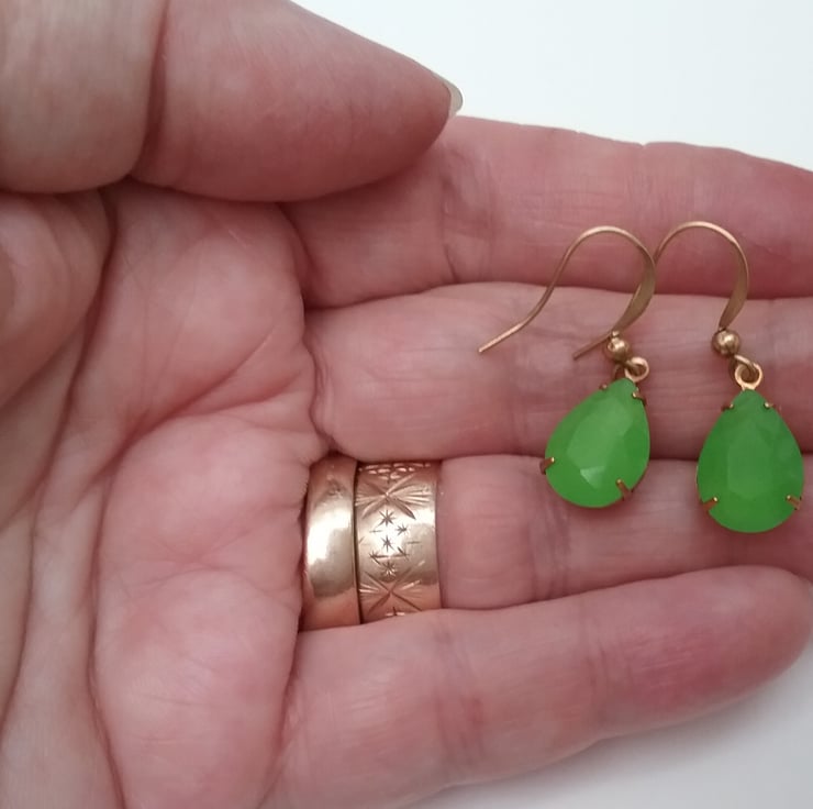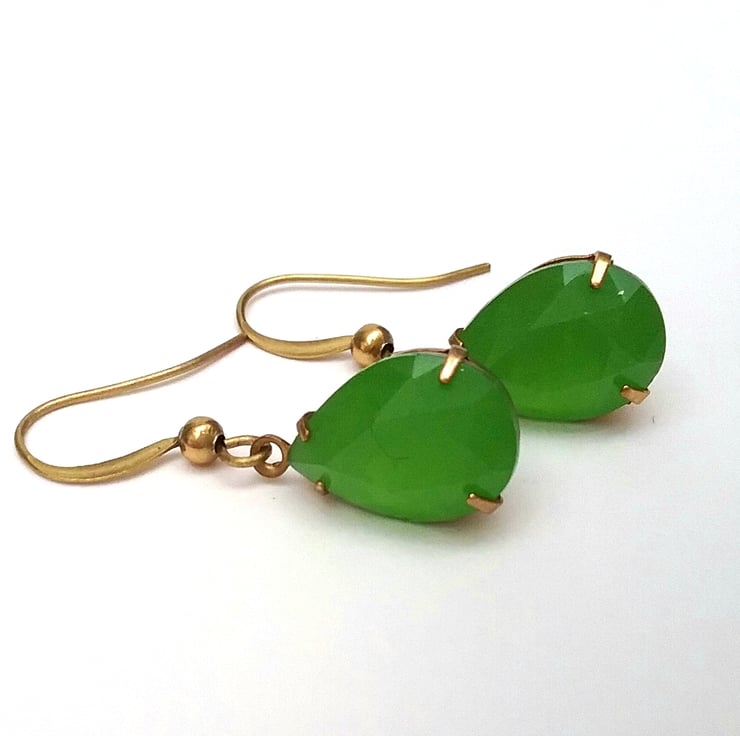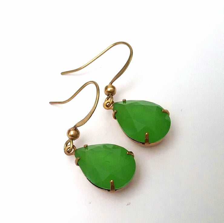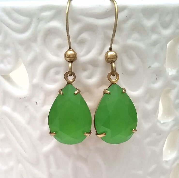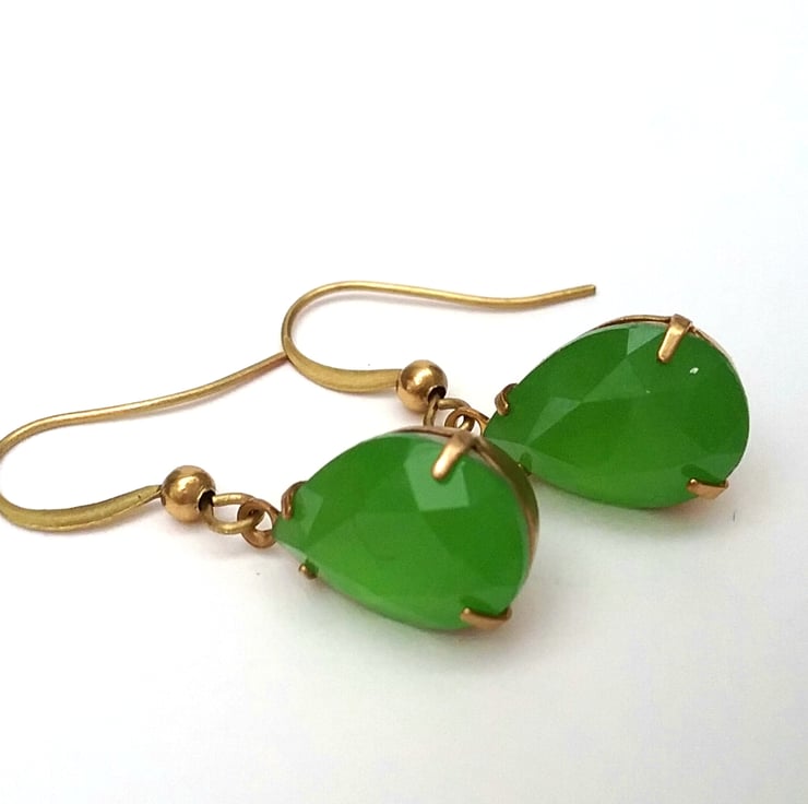 .Pretty teardrop shamrock green opal glass earrings set into raw brass claw teardrop setting