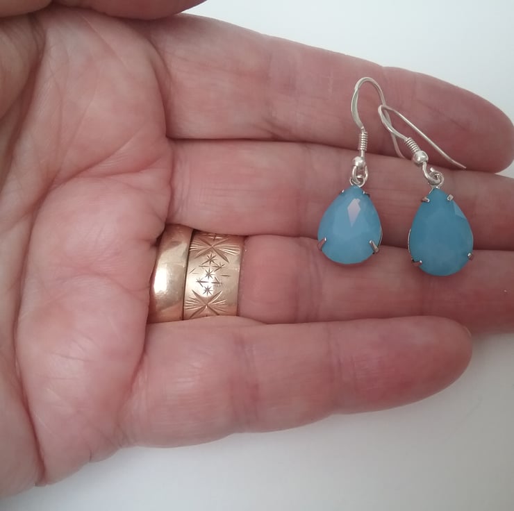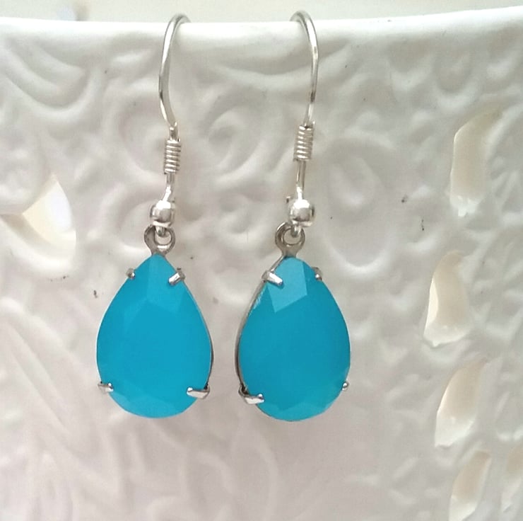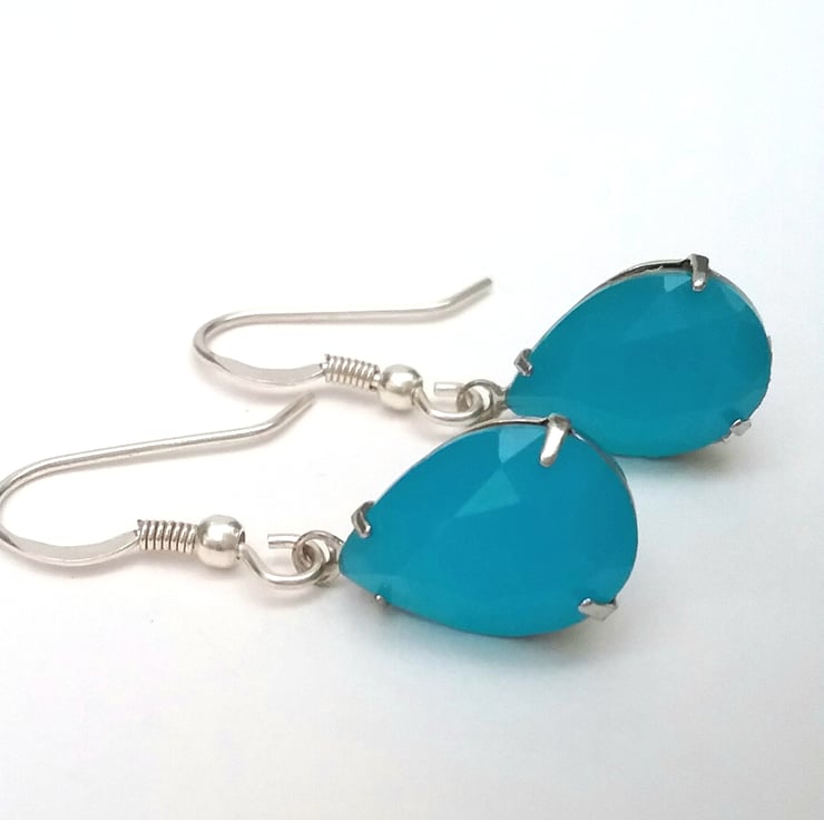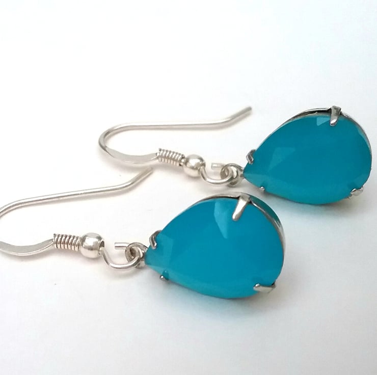 .Pretty teardrop Pacific blue opal glass earrings set into silver tone claw teardrop setting
