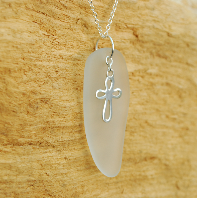 We always choose our pieces of tumbled beach glass carefully to go with our charms. This sterling silver cross charm fits beautifully on the frosty glass behind it. The glass has come from an old bottle and curves gently behind the cross. All the metal used in this pendant is sterling silver.