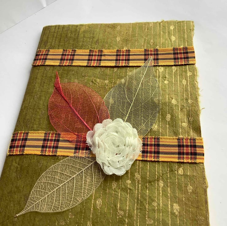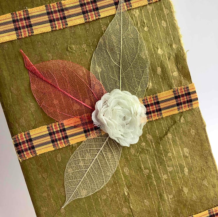 3 skeleton leaves and a white flower sit on middle tartan ribbon.