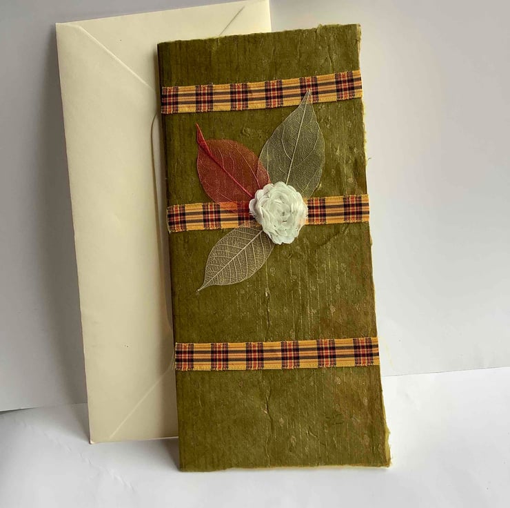 This green and gold paper covers the front of this card with 3 strips of tartan ribbon ( unsure of tartan but similar to Macleod)