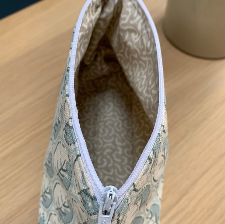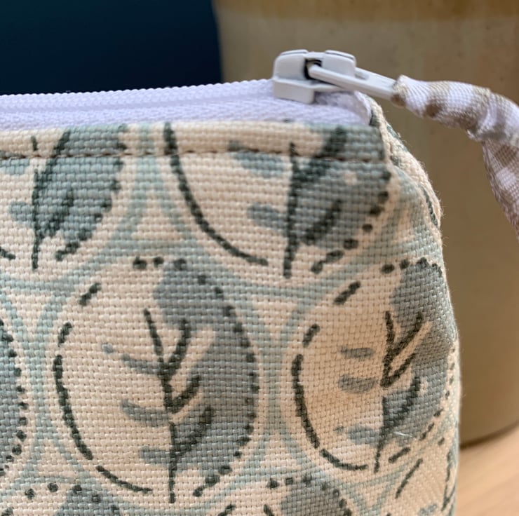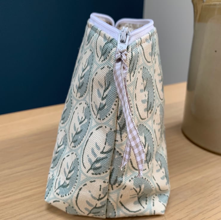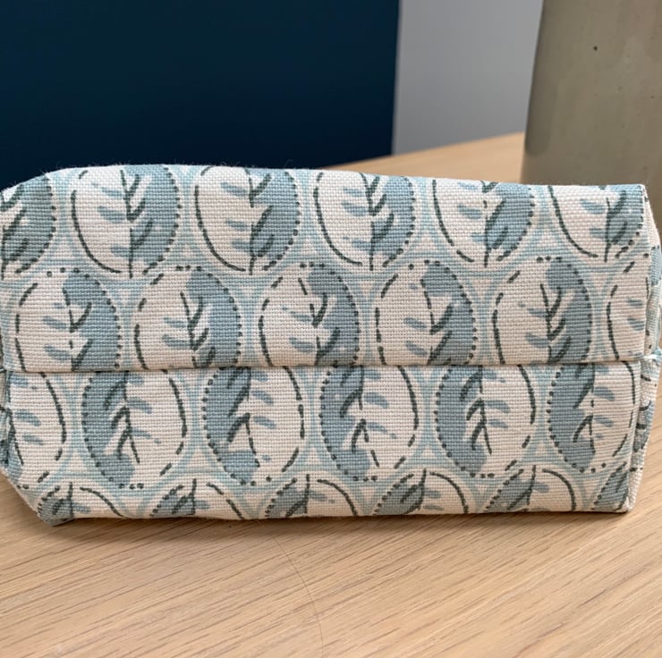 Cute cosmetic bag in Vanessa Arbuthnott Little Leaves linen union. The bag is fully lined in a beige linen-mix fabric and has a wide flat bottom. A layer of interfacing gives the bag some structure.