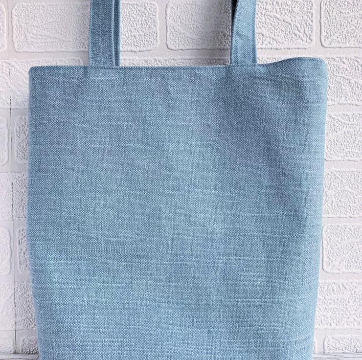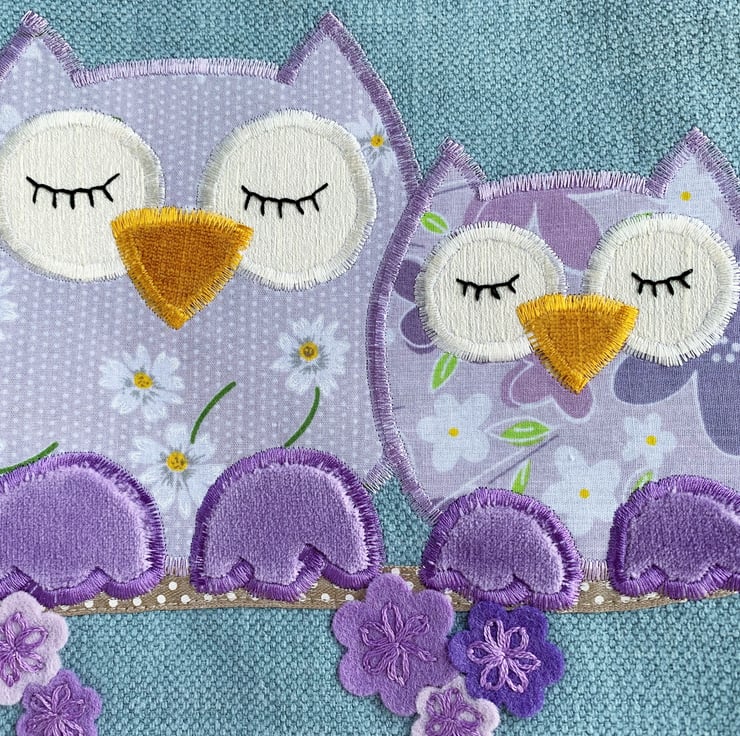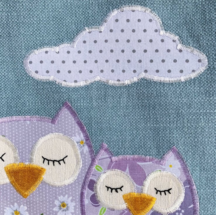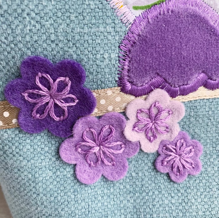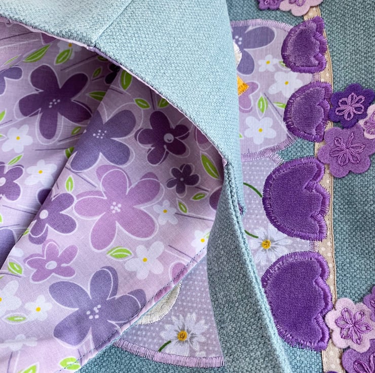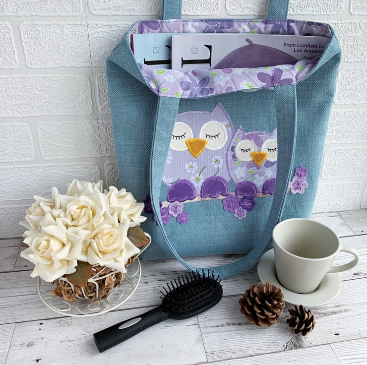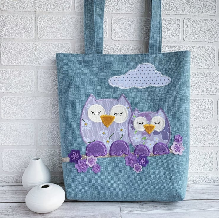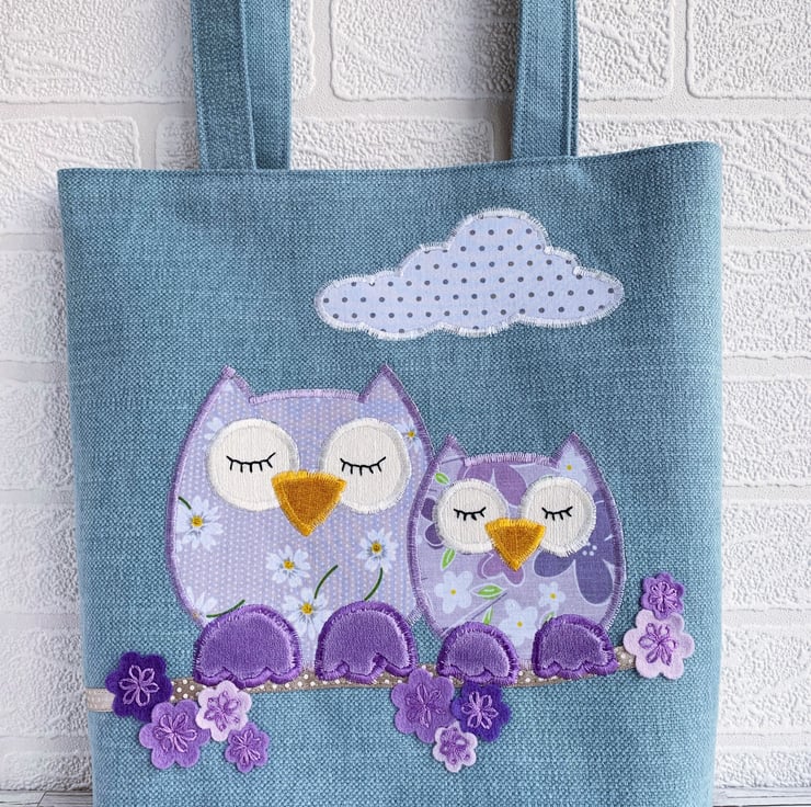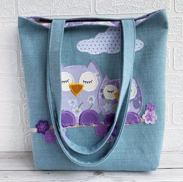 Spring owls and blossom tote bag. This pretty tote bag is made from pale blue fabric with an appliqué design depicting two owls sitting on a blossom branch. The owls are made from co-ordinating lilac print fabrics – the larger one with a pattern of white and yellow daisies and white polka dots, and the smaller one with purple, lilac, and white flowers. The owls have lilac velvet feet and golden-yellow velvet beaks. Their eyes are cream and I've hand-embroidered black sleepy eyelashes on them. They are sitting on a branch made from beige satin ribbon with white polka dots. The blossom is made from felt flowers in shades of lilac and purple, which I’ve hand-embroidered in place with purple lazy daisies. Above the owls, I've added a cloud in white fabric with grey polka dots. The bag is lined with the same lilac floral fabric that the smaller owl is made from.