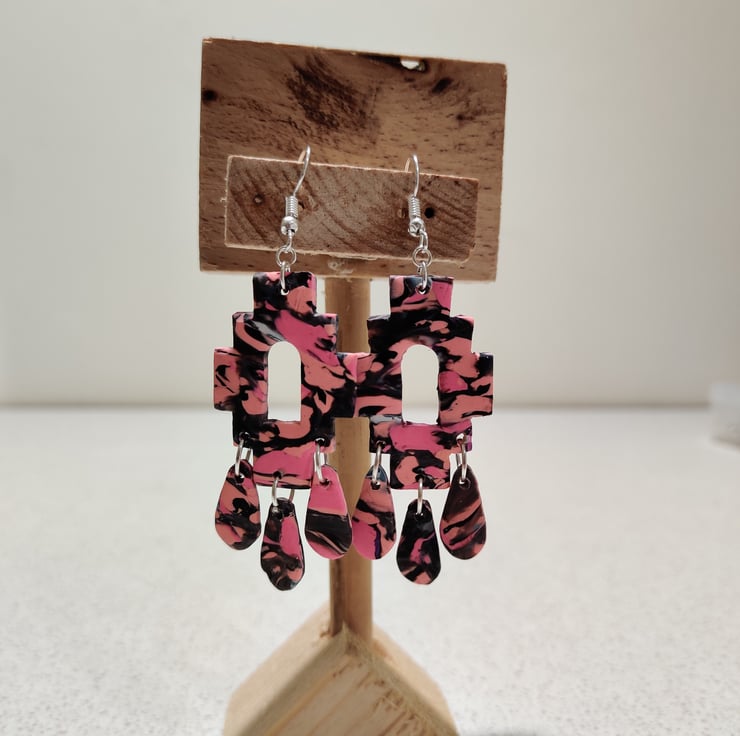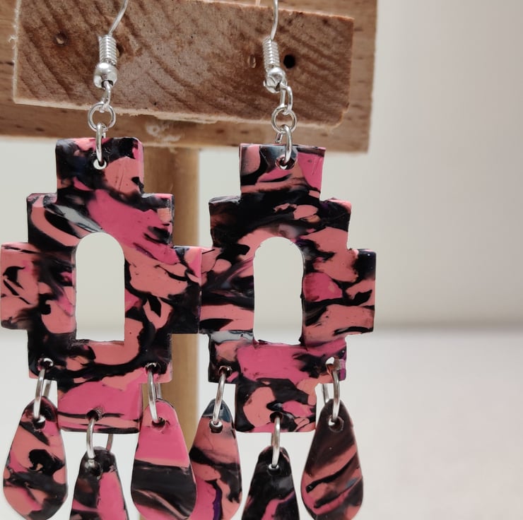 Hand made polymer clay earrings with an abstract pattern and Aztec shape. Small/medium sized. Hook fixing which can be painted with hypoallergenic coating for free on request. Please see all photos for close up detail. All products handmade therefore there may be minor imperfections. Each pair sold as seen, message for more info