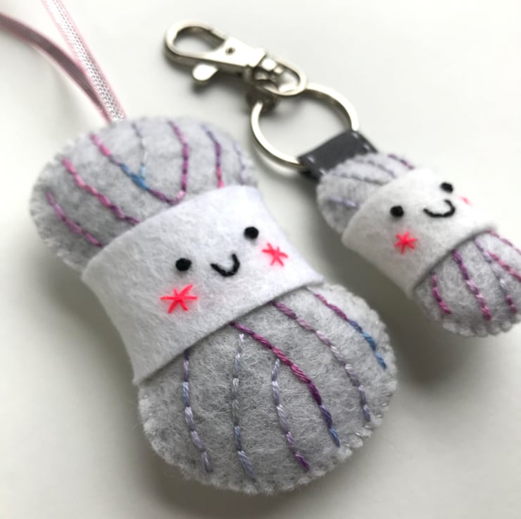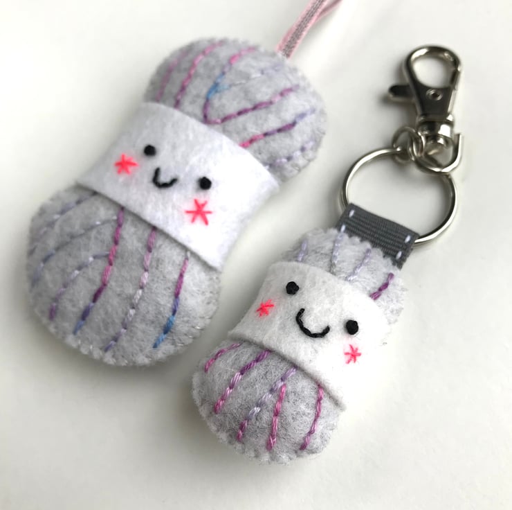 Each yarn ball is hand stitched with multicoloured embroidery threads, onto 100% wool felt. The large yarn ball is stuffed with lavender and a little toy stuffing. On the keyring, the ribbon loop is also held in place with glue and hand stitching.