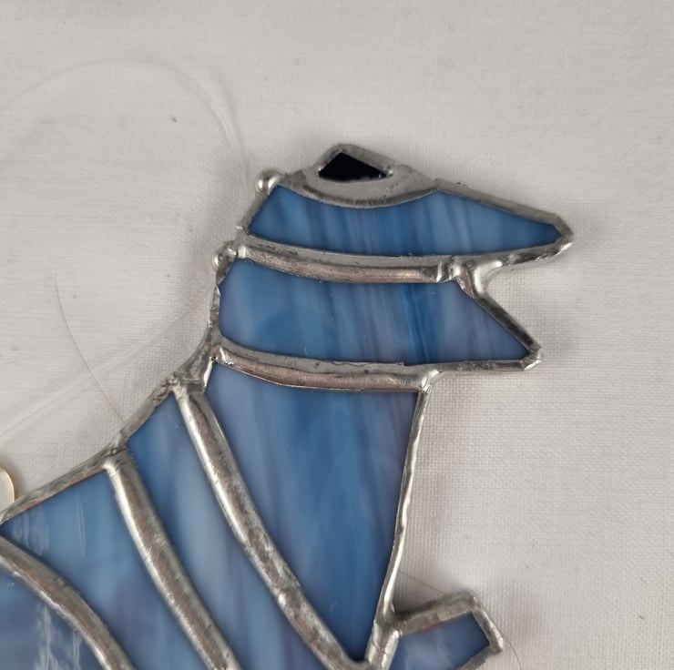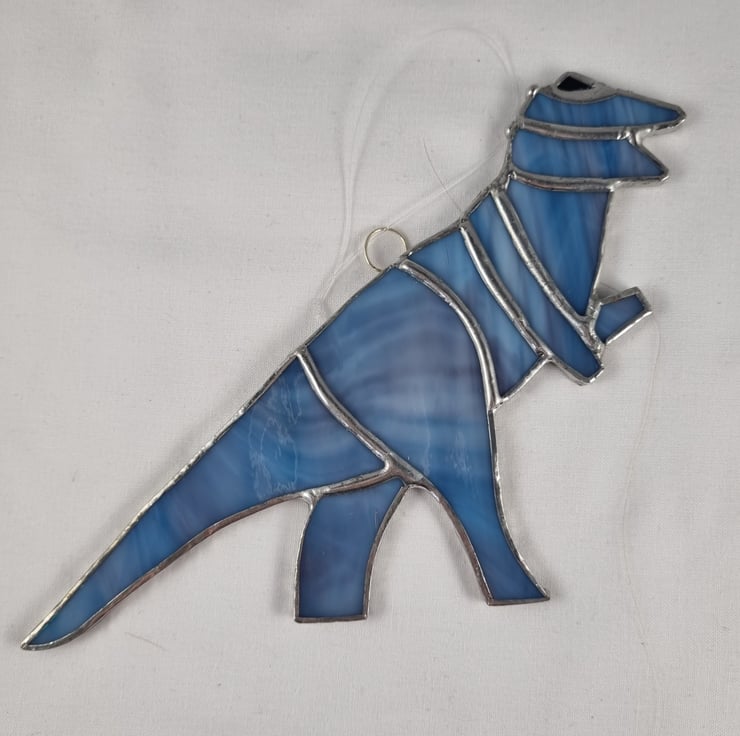 This Tyrannosaurus rex is made using blue glass and has a rind and invisible thread for hanging.