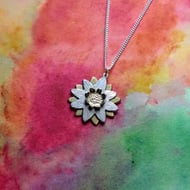 Handmade in our Yorkshire studio, this beautiful Pendant has dimpled textured Brass leaves and a rounded Silver stem which is tapered towards the bottom. Comes with an attached Sterling Silver Curb Chain (Please select your desired chain length at checkout). The Pendant has a subtle shiny finish. The leaves and stem are created completely by hand and the texture is hand hammered so each piece is unique.