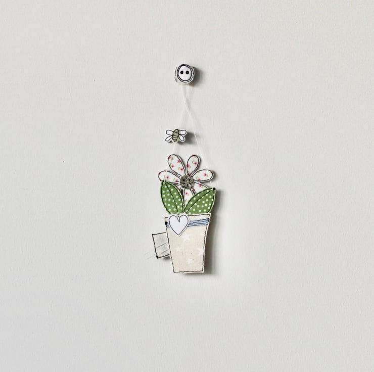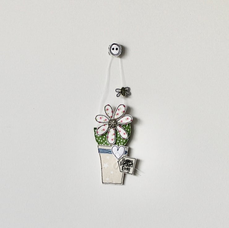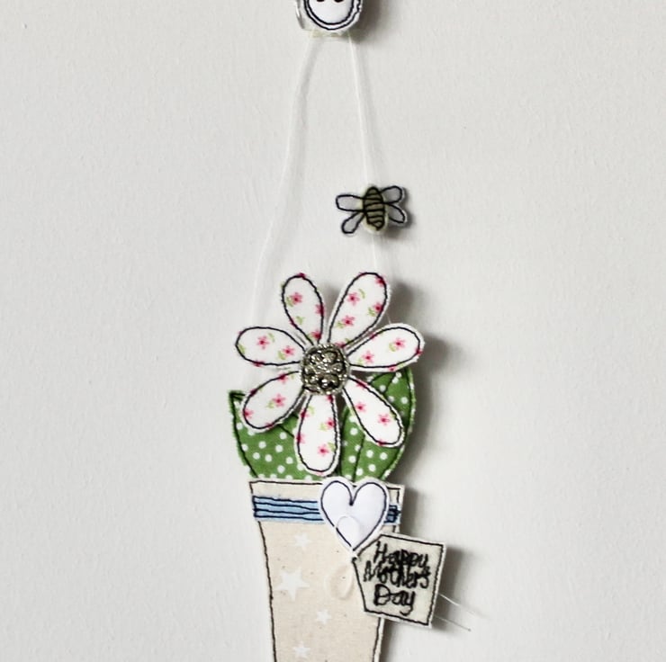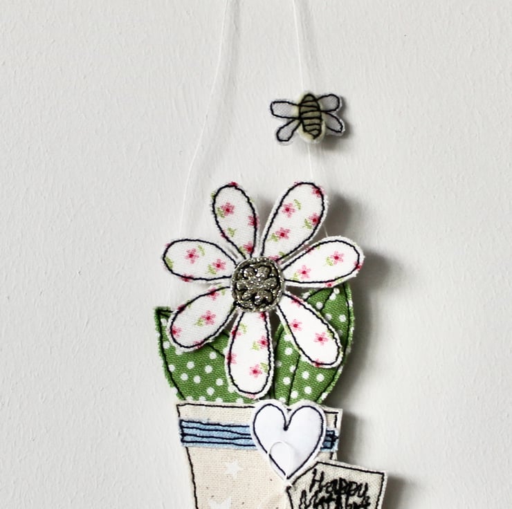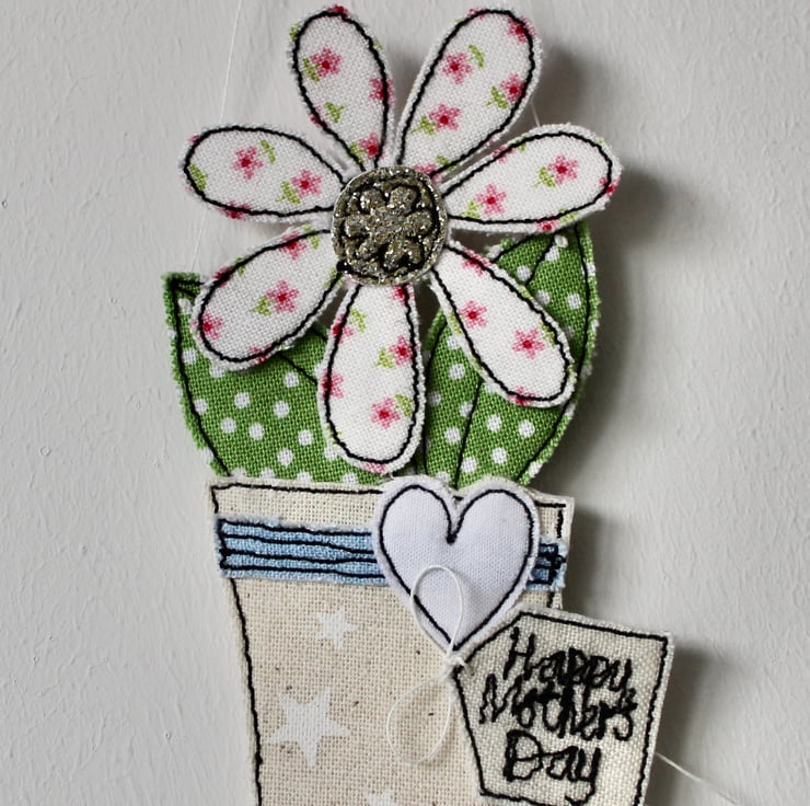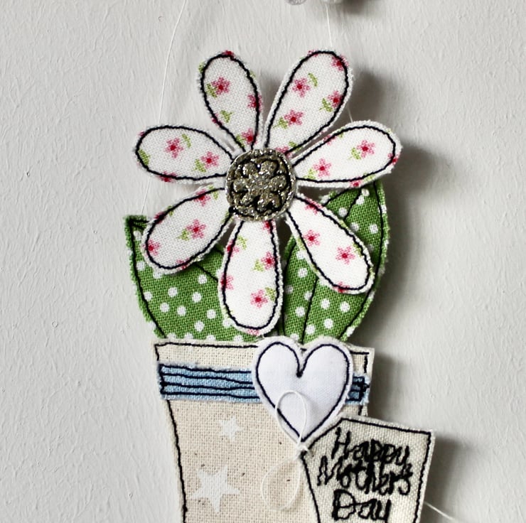 'Happy Mother's Day' flowerpots are sewn using cotton cloth, glitter cloth and free hand machine embroidery; multiple layers of cloth are sewn together and cut out by hand using sharp scissors. With a linen string to suspend.