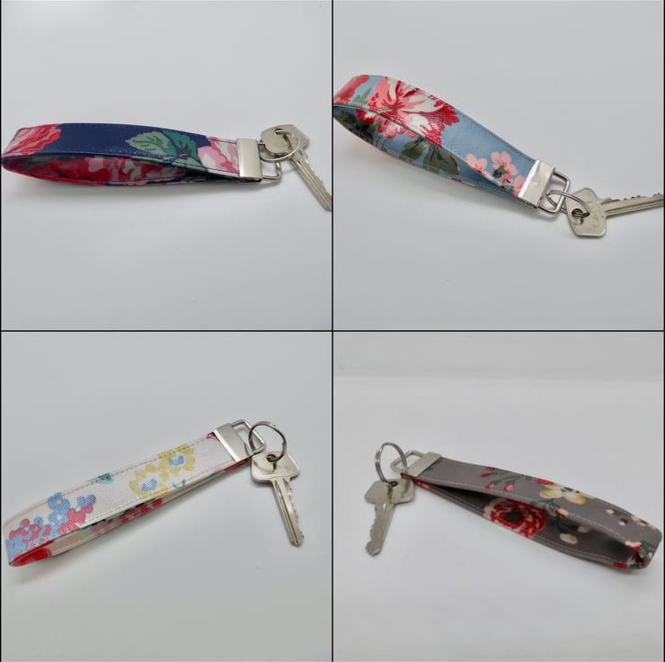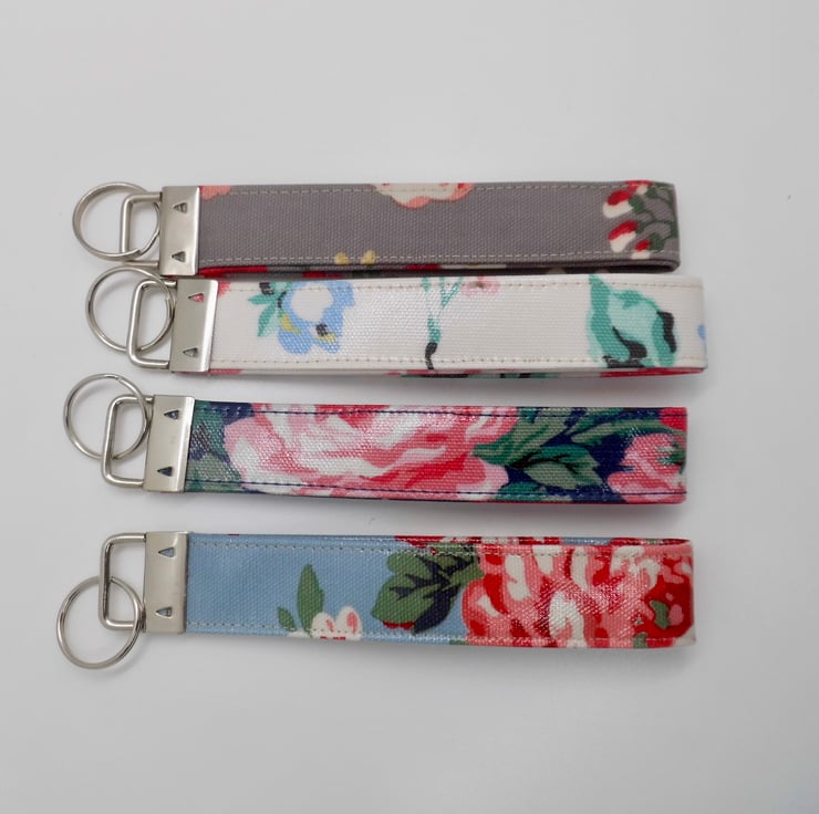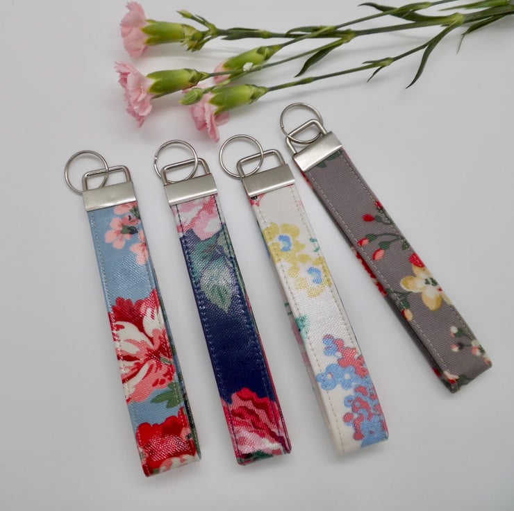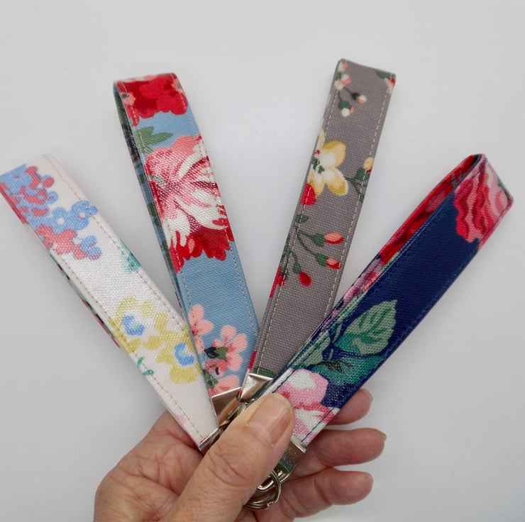 A pack of 4 wrist strap key rings. Made using a selection of Cath Kidston oilcloth fabrics which are strong and wipe-clean as well as very pretty.
