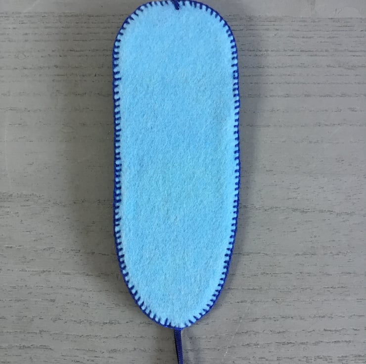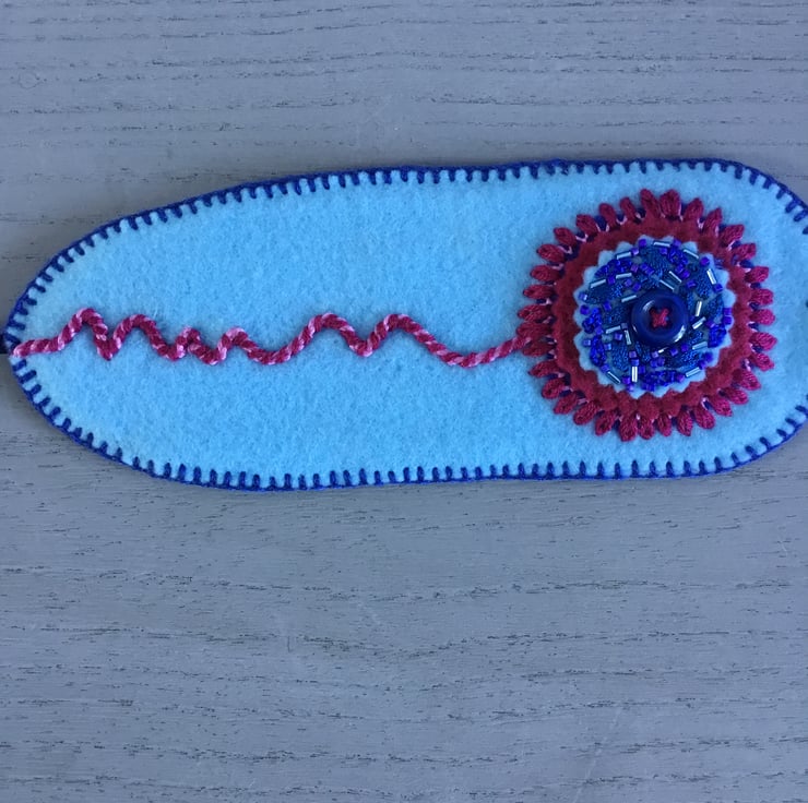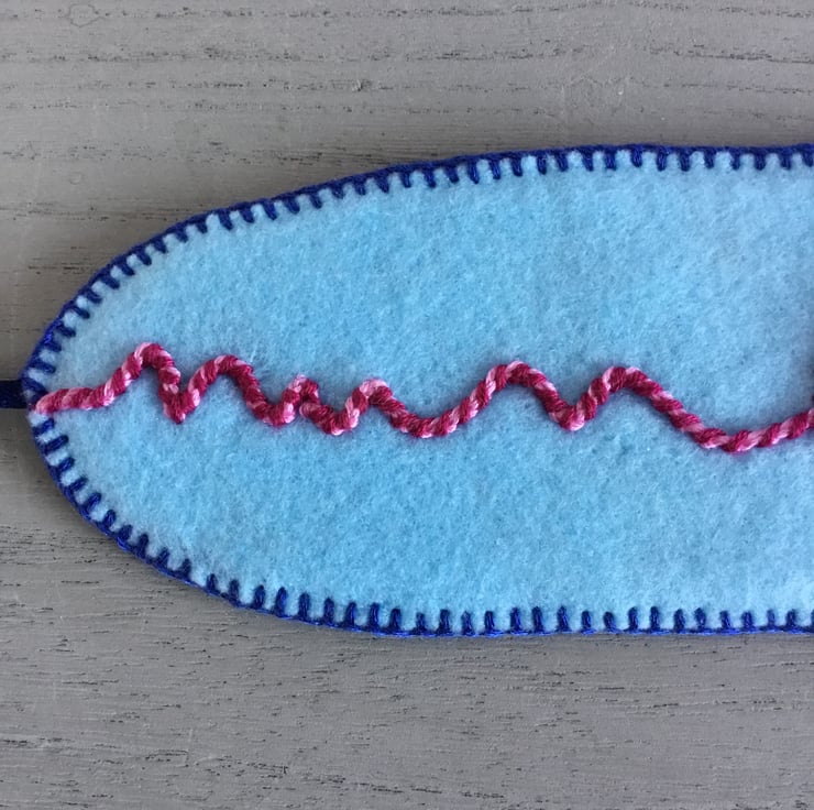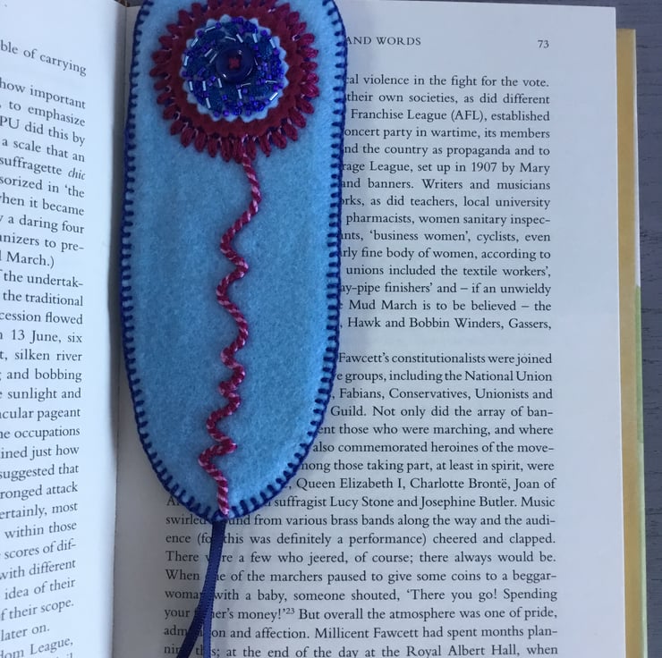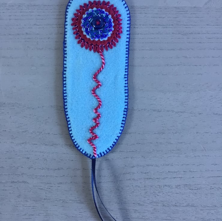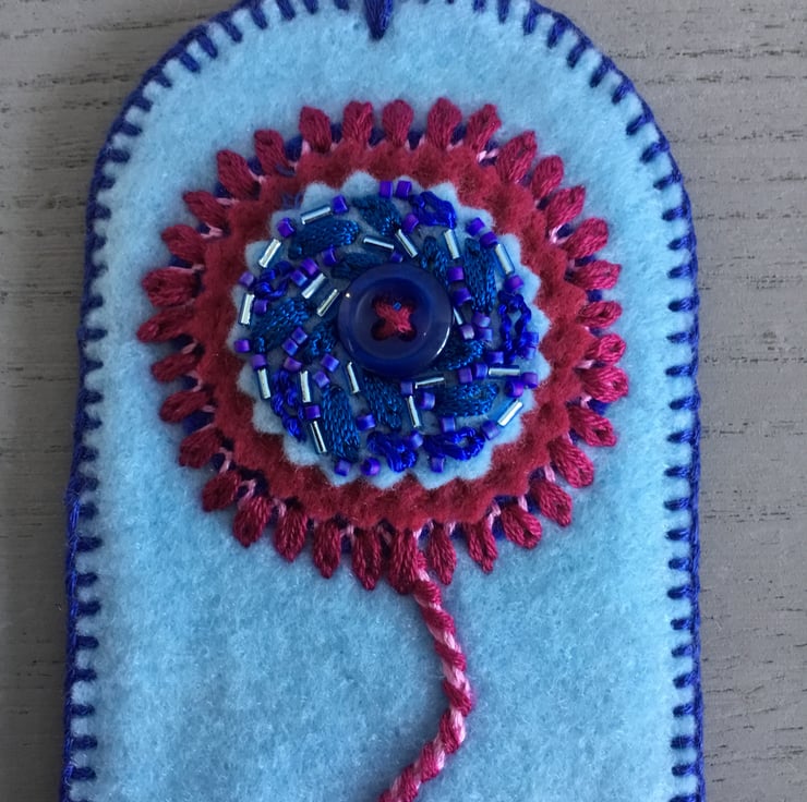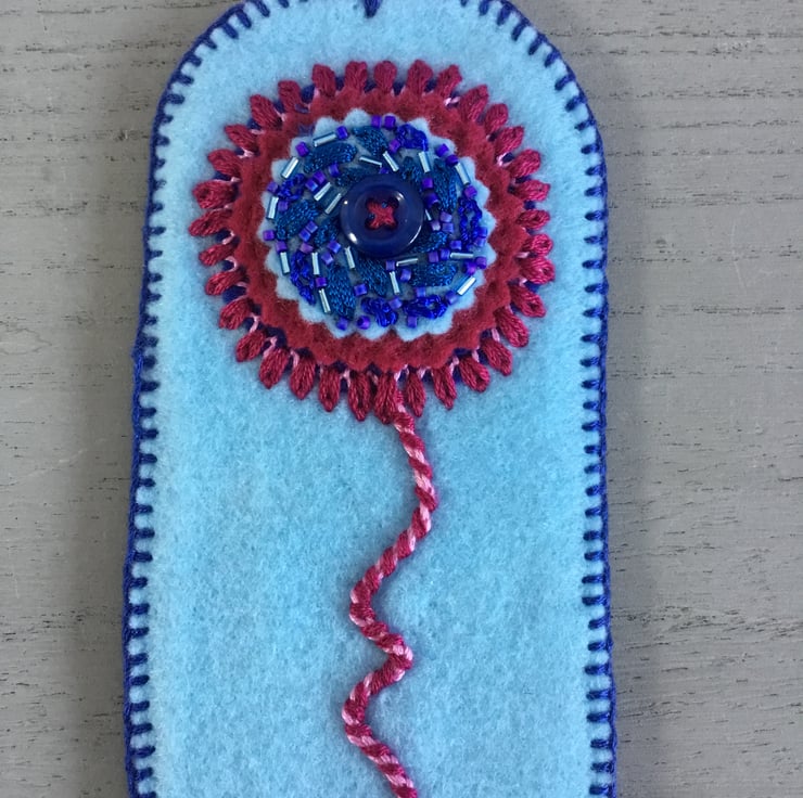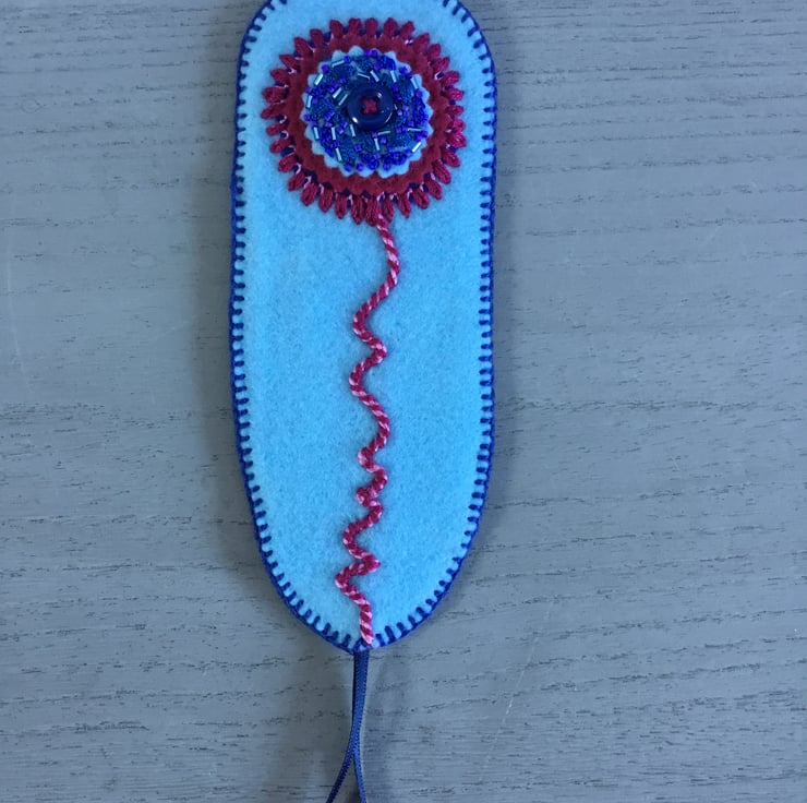 This felt bookmark with its chrysanthemum flower is hand embroidered with petals in Lazy-Daisy Stitch in red and blue threads, dotted with seed beads and a blue button for the flower stamen. It’s edged in blue Blanket Stitches and has a navy blue ribbon decoration at the bottom. The chrysanthemum flower’s stem of Whipped Chain Stitch in pink and red threads has a secret message...... turn it sideways and the word MUM is written....... making this bookmark just for Mum. ..... and the book she’s reading.