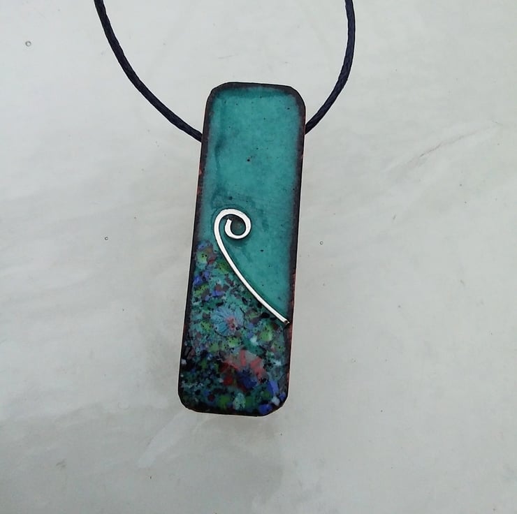 This delightful pendant measures approx. 10mm wide x 35mm long. I have made it from copper, kiln-fired a base coat, fired, added flowers, fired, fused sterling silver wire design, fired, then added enamel crystals and last firing. After soldering an attachment for chain or waxed cotton thread, this piece has been highly polished and I've included a long length of waxed cotton thread for you to tie at any length you desire.....voila! It also arrives in a gift box.