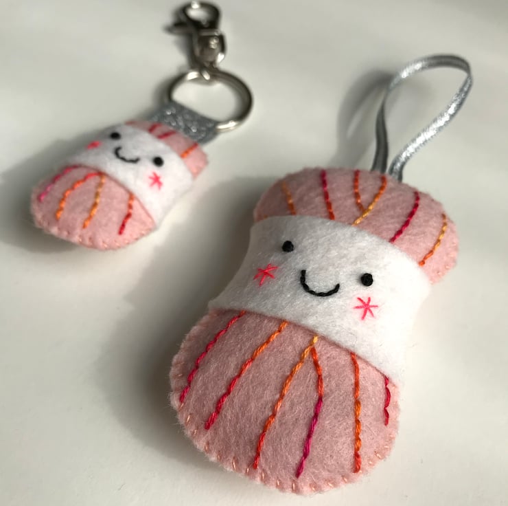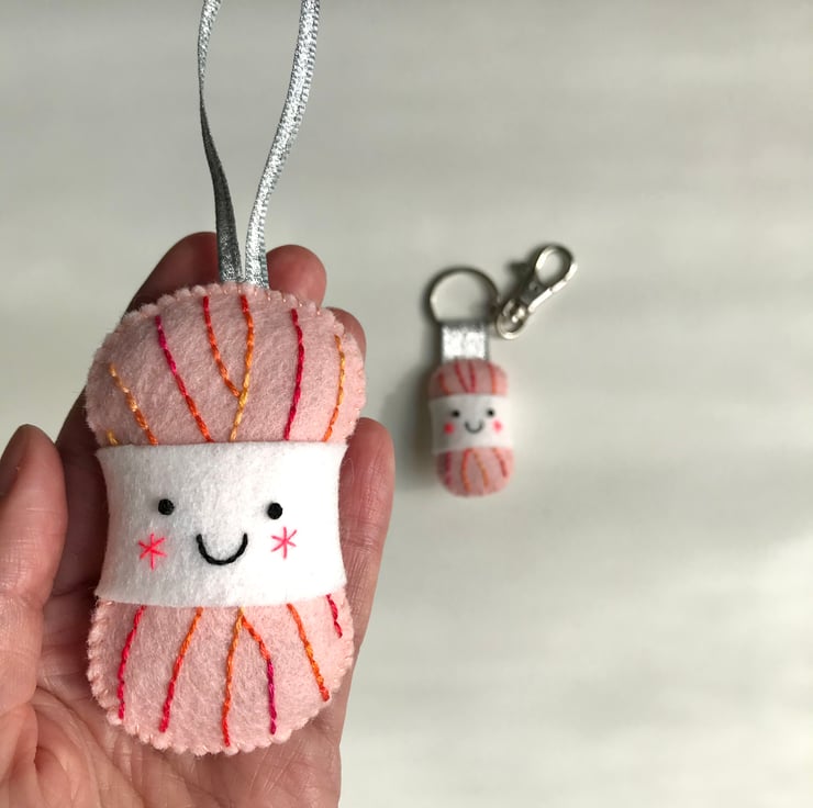 Each yarn ball is hand stitched with multicoloured embroidery threads, onto 100% wool felt. The large yarn ball is stuffed with lavender and a little toy stuffing. On the keyring, the ribbon loop is also held in place with glue and hand stitching.
