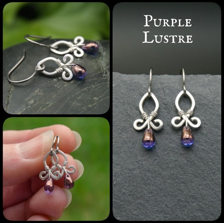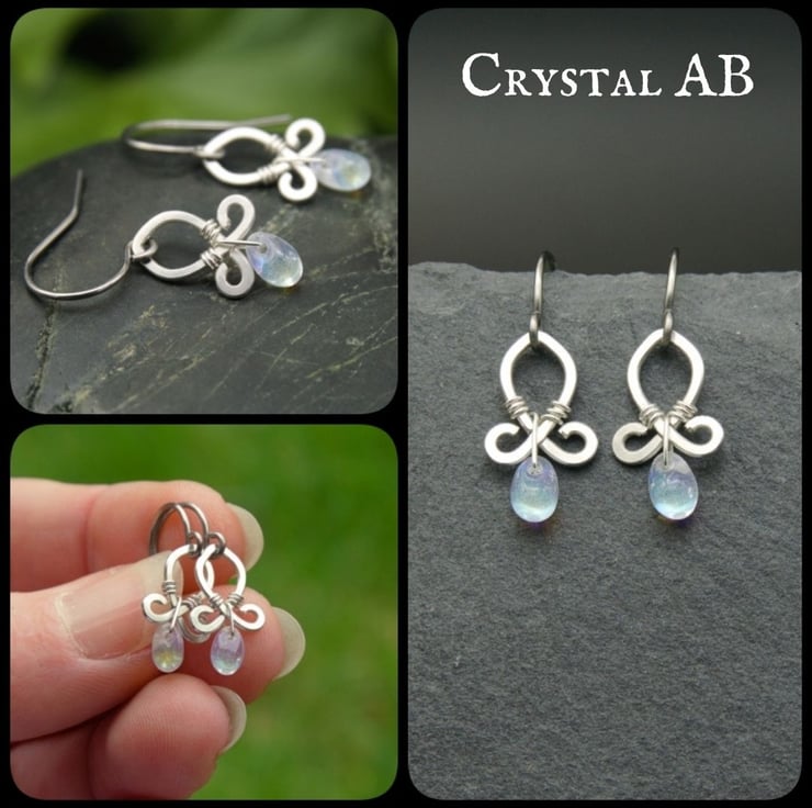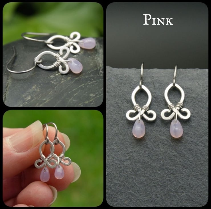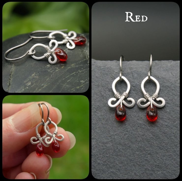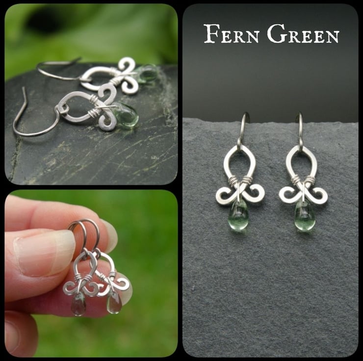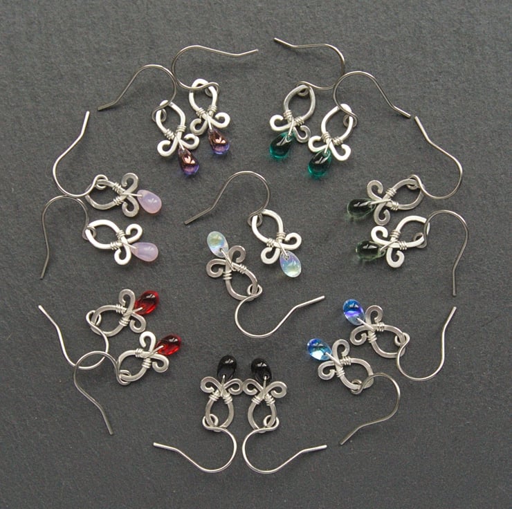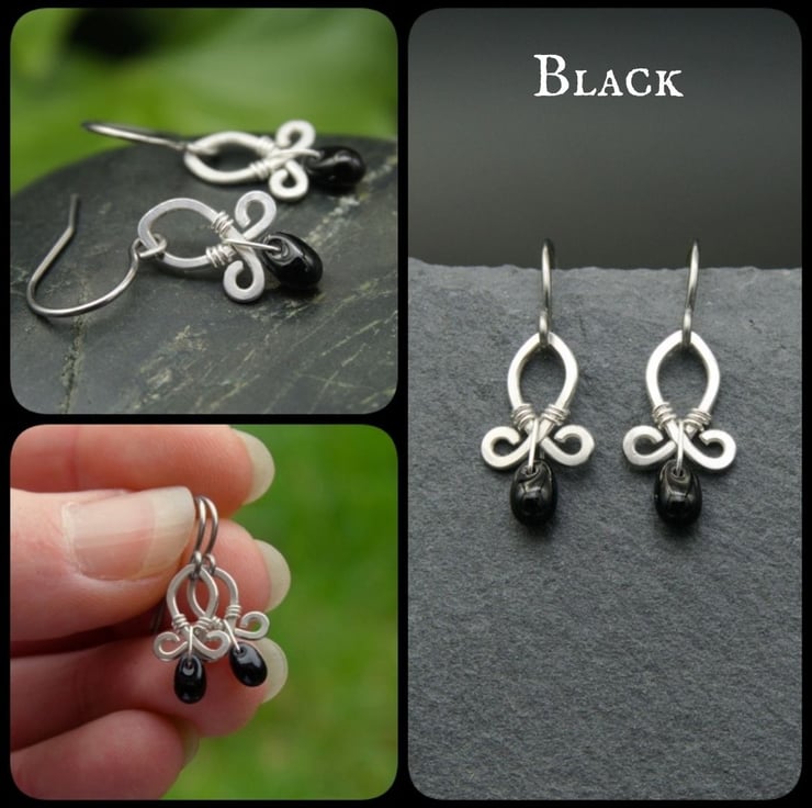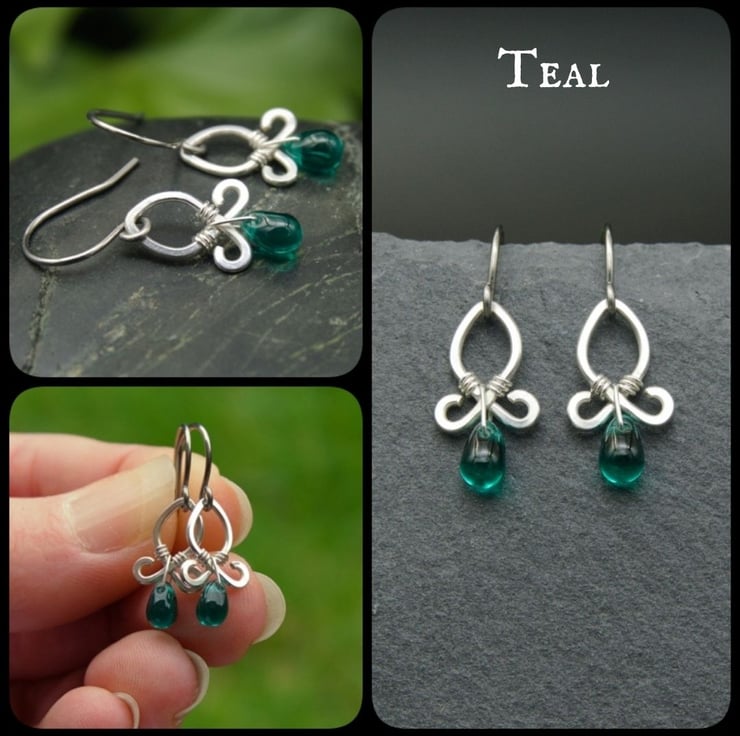 Beautiful small silver drop earrings - available in a choice of colours. I’ve always called these dainty earrings the ‘fleur’ as the shape reminds me of a fleur-de-lis, & the matching sterling silver drop shapes do look like little hanging flowers! They’ve been created by first forming the fleur shape from thicker silver wire which is then hammered flat. Glass drop beads have then been added with fine sterling silver wire to the bottom of each earring. These gorgeous little drop earrings are simple yet still unusual & would make a wonderful gift, or just a lovely treat for yourself!