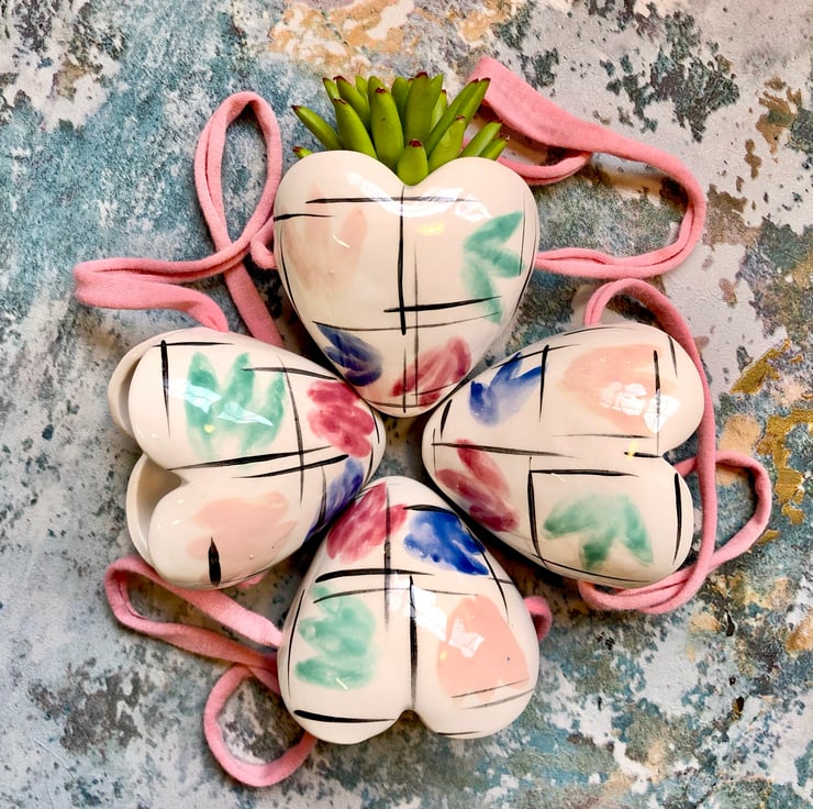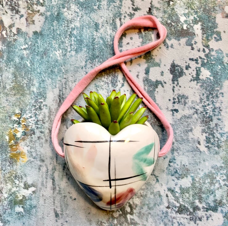 A heart shaped ceramic pot, made in a white earthenware clay and glazed in a vintage style floral geometric pattern. Finished with a repurposed pink jersey cord for hanging it up.