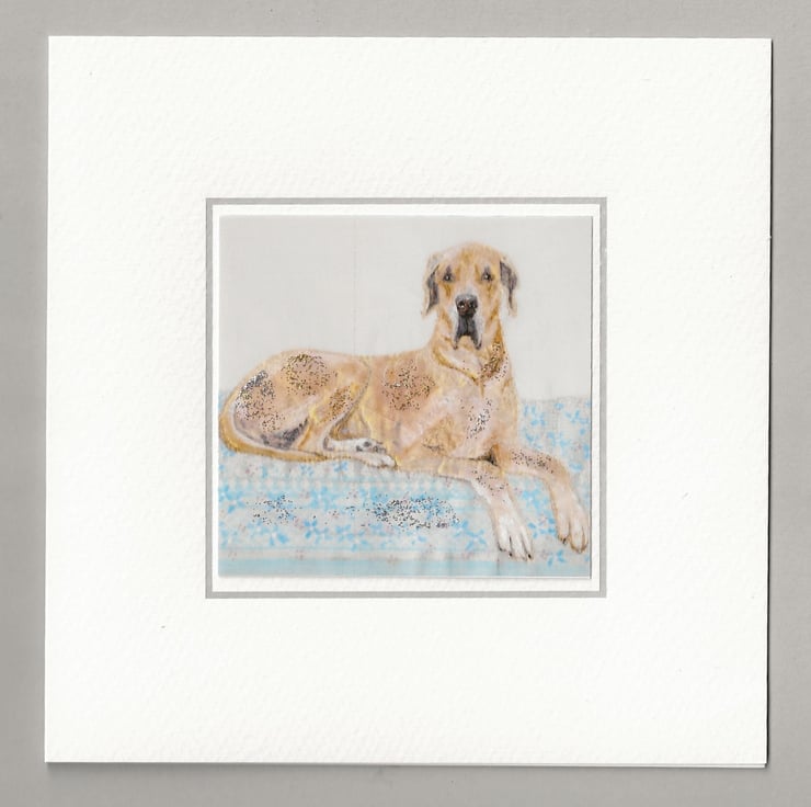This handsome fellow is taken from an original embroidered pet portrait, created by myself for a very happy dog owner. His name is Gordon and his portrait was originally commissioned as a birthday present for Gordon's owner. I have created his card to add to my range of pet portrait cards. This card can be personalised with a name or a greeting of your choice or simply left blank. Perfect for framing.