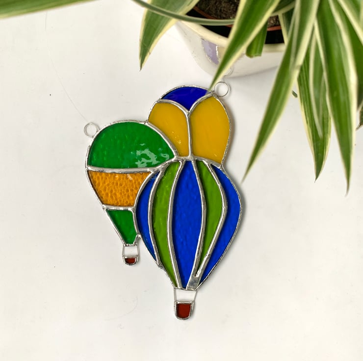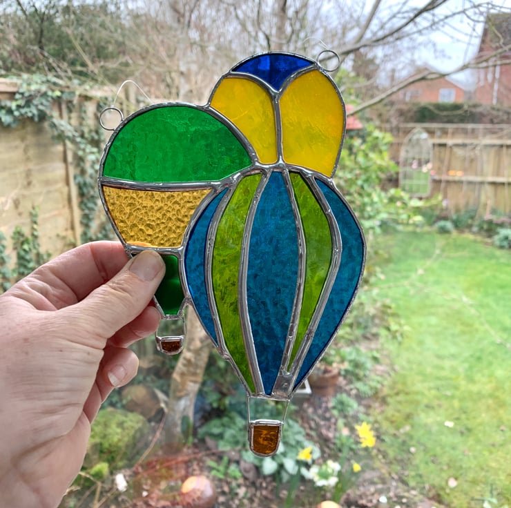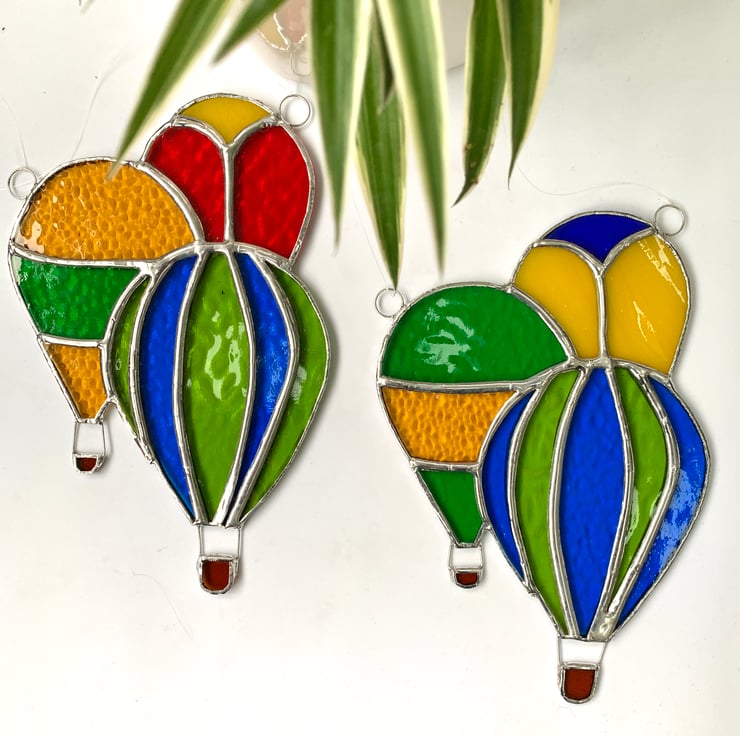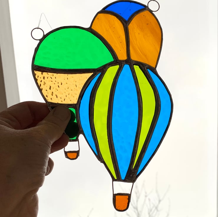 This handmade stained glass suncatcher is a collection of 3 hot air balloons (or a drift which is the collective noun for a group of hot air balloons) out of a selection of 7 different types of beautifully coloured stained glass.