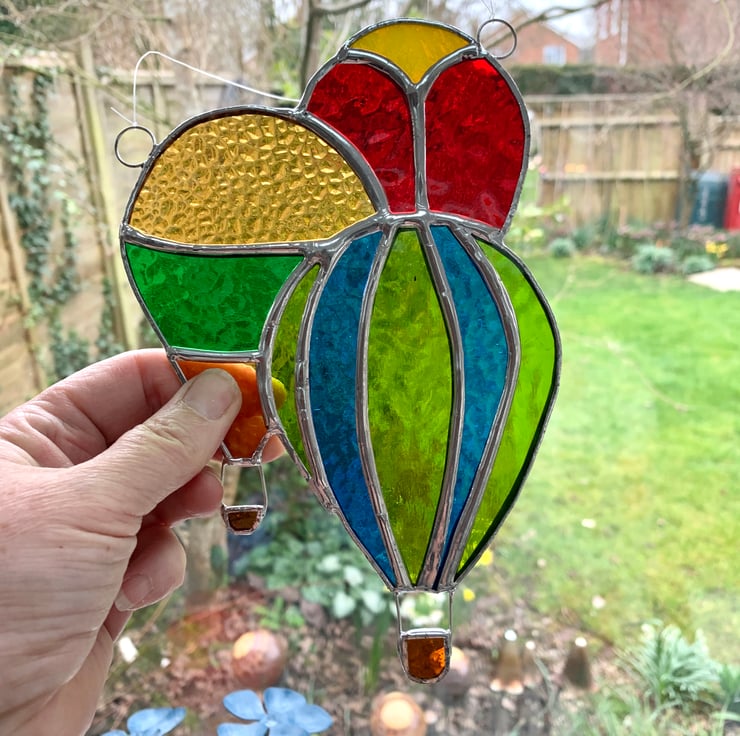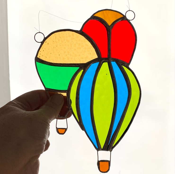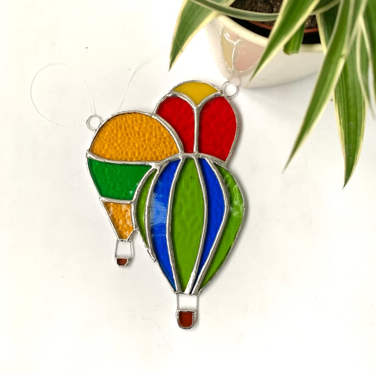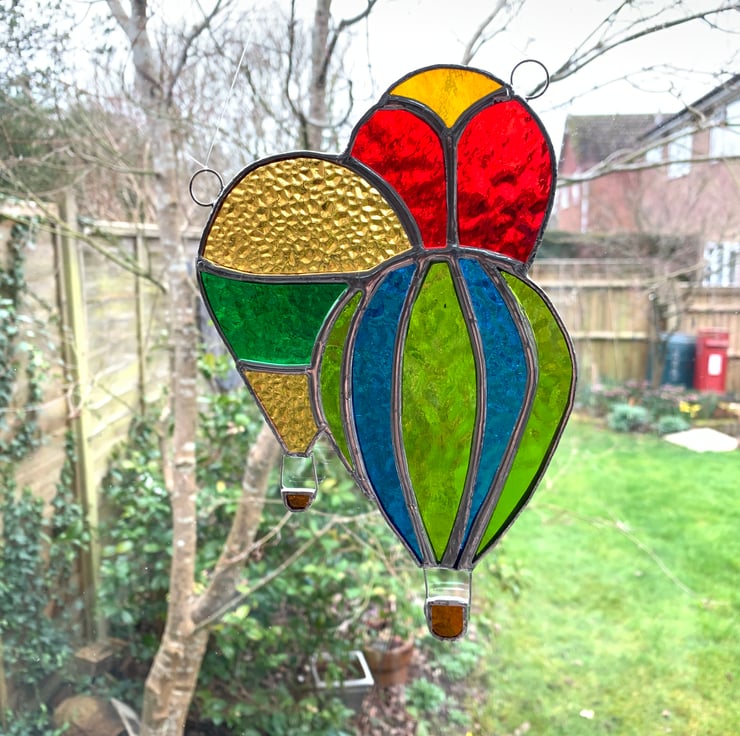 This handmade stained glass suncatcher is a collection of 3 hot air balloons (or a drift which is the collective noun for a group of hot air balloons) out of a selection of 7 different types of beautifully coloured stained glass.