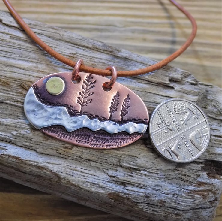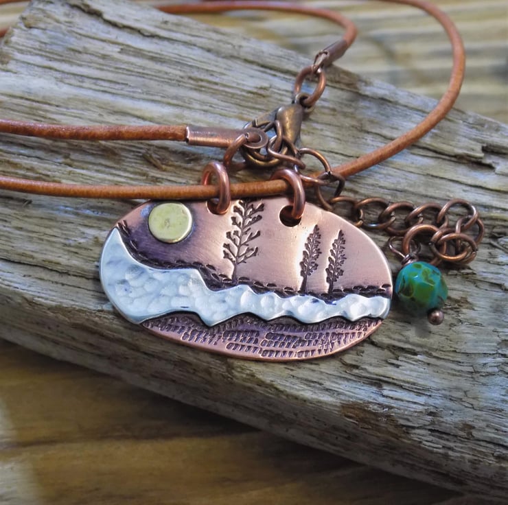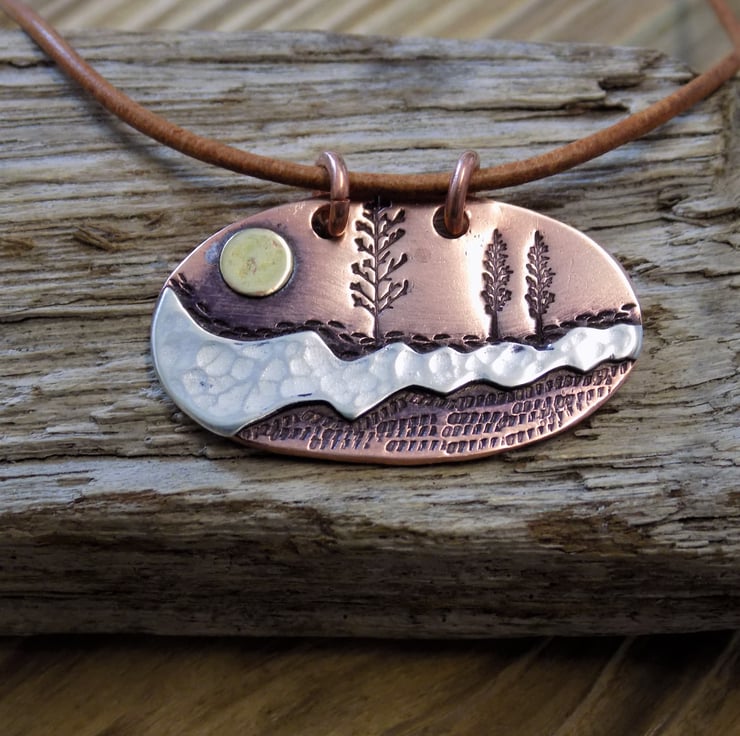 Made from copper, sterling silver and brass sheets. The silver middle ground has been sawn out by hand and carefully soldered to the copper and given a dappled texture. Various textures have been added to the copper around pretty trees and a brass sun has been added to set the scene. Given an aged look to pick out the detail and show the contrasts between the metals. Suspended on a vintage brown leather necklace - adjustable from 16-18" ,