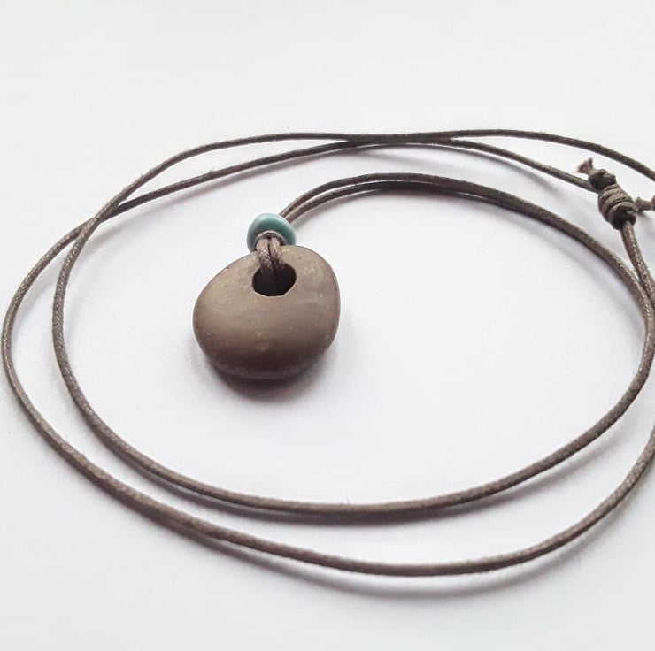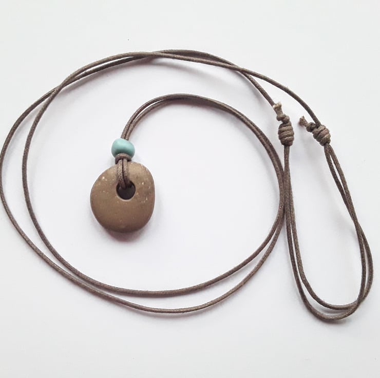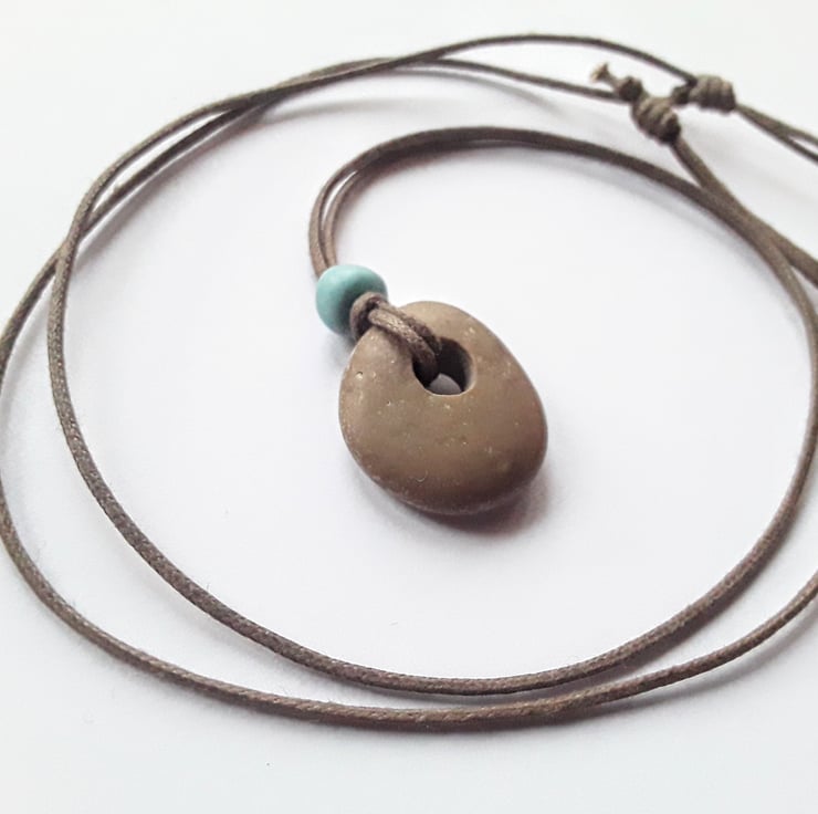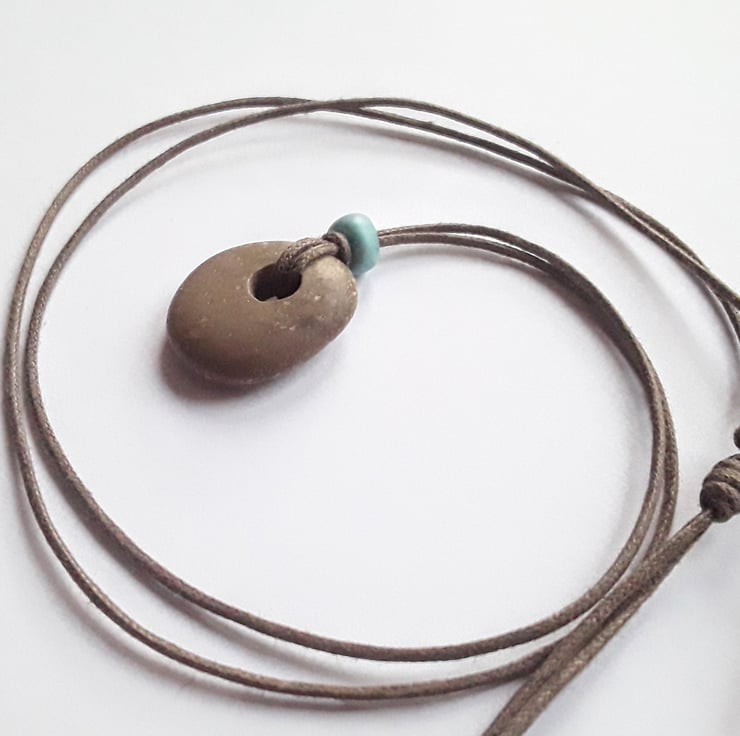A lovely little cappuccino-coloured oval pebble, measuring approximately 2cm x 2cm, with a large, clean drill-hole, hanging from a 30" coffee-coloured silken, 1mm adjustable cord.