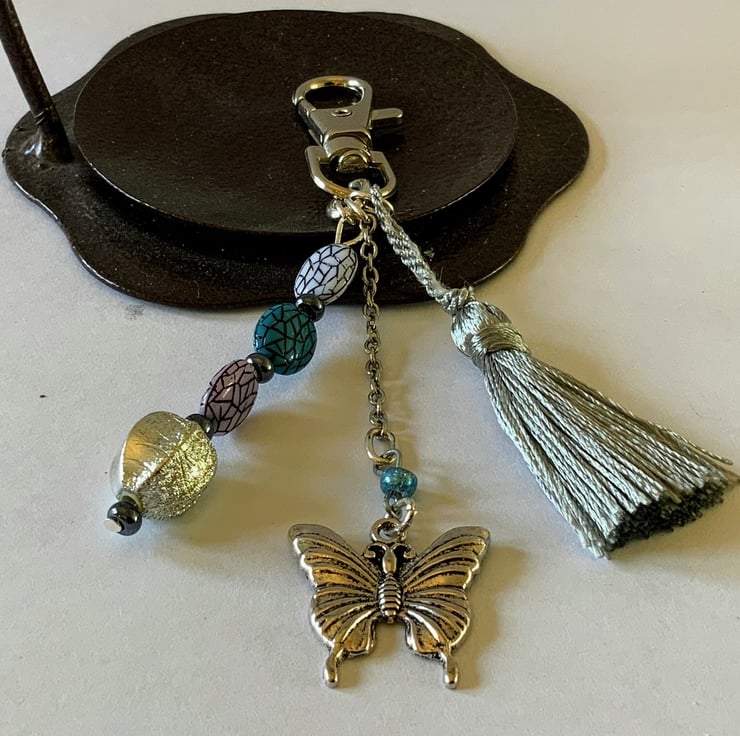 Metal Butterfly & Tassel Bag Charm. Can also be used as a keyring holder.