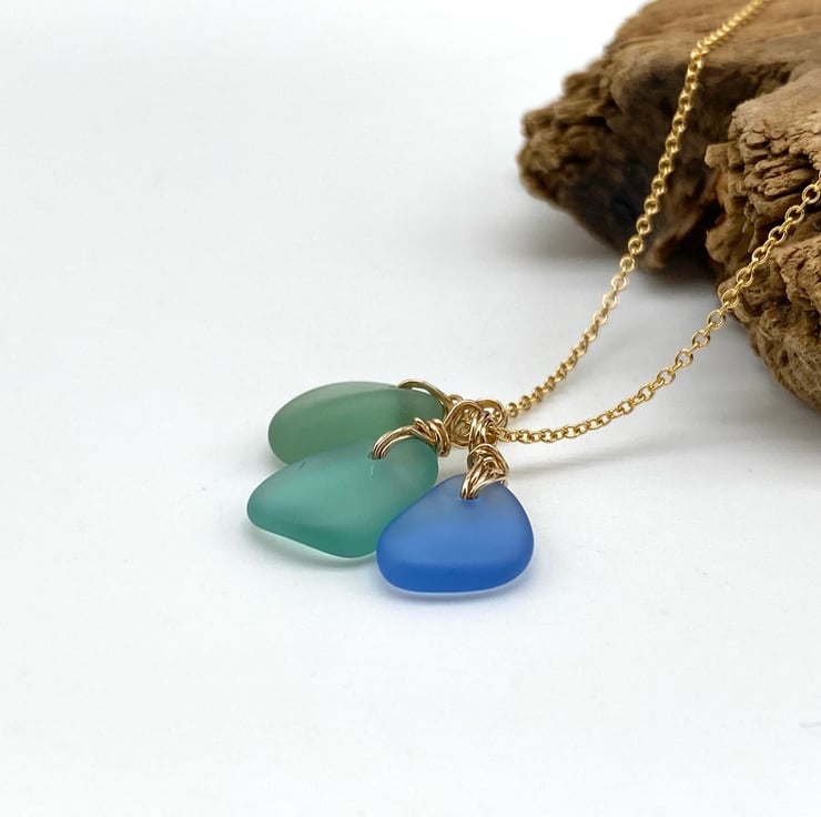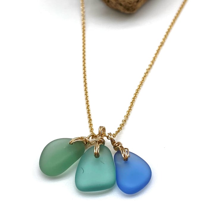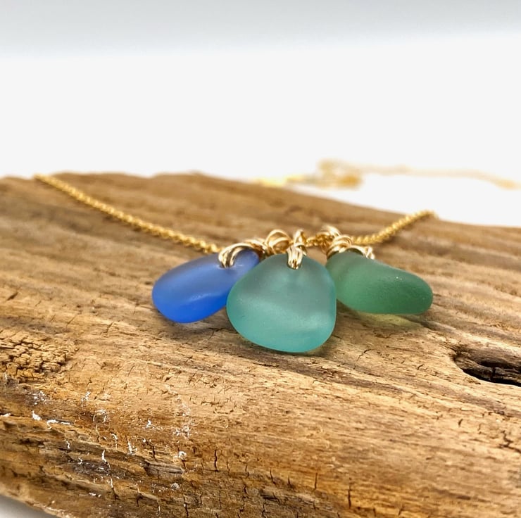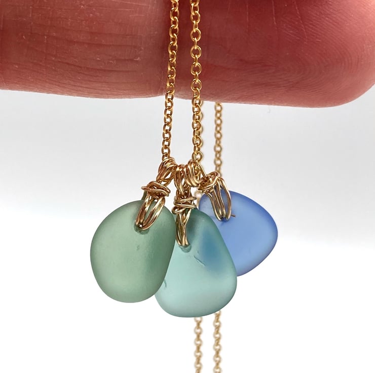 Each piece of sea glass has been hand wrapped in gold filled wire and hung on an 18 inch gold filled chain.