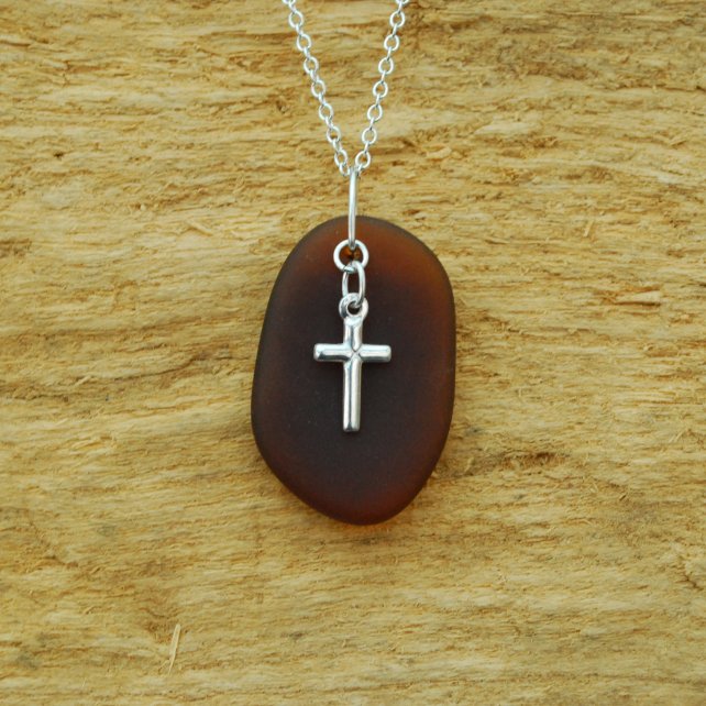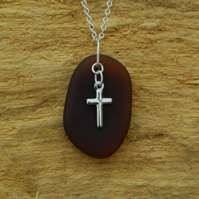 Silver somehow manages to look great against light and dark backgrounds, and this is one of the darker ones. The piece of tumbled brown beach glass we've used for this pendant is beautifully shaped and goes perfectly with the sterling silver cross. The cross has nice detail as can be seen in photo 3. All the metal used in this pendant is sterling silver.