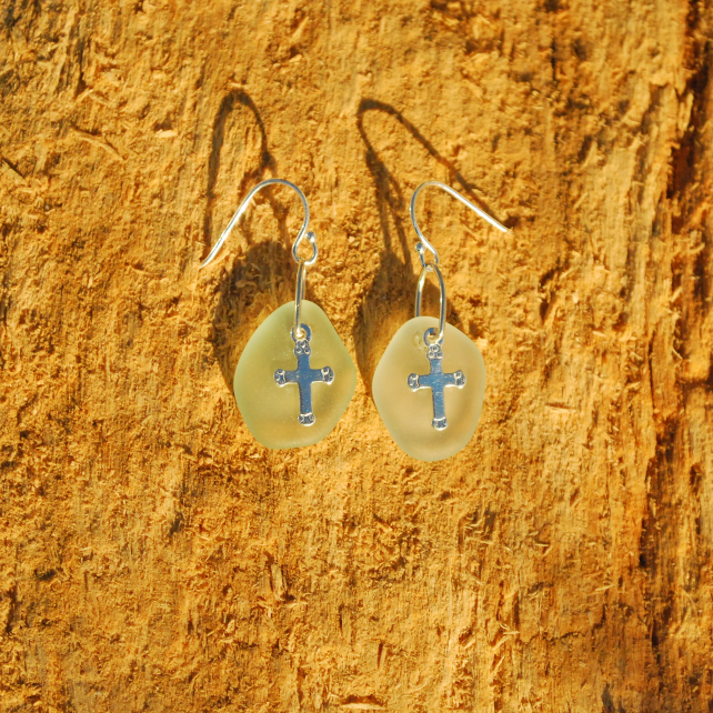 These enchanting earrings are the pale aquamarine colour of old glass bottles. This was the main colour of bottles before white glass could be made cheaply. The tumbled glass pieces are beautifully matched and look lovely behind the tiny sterling silver crosses. We have mounted the earrings on sterling silver ear wires.