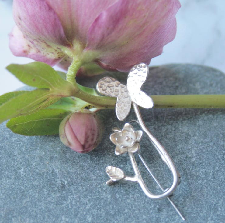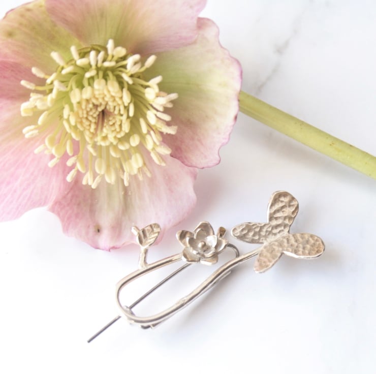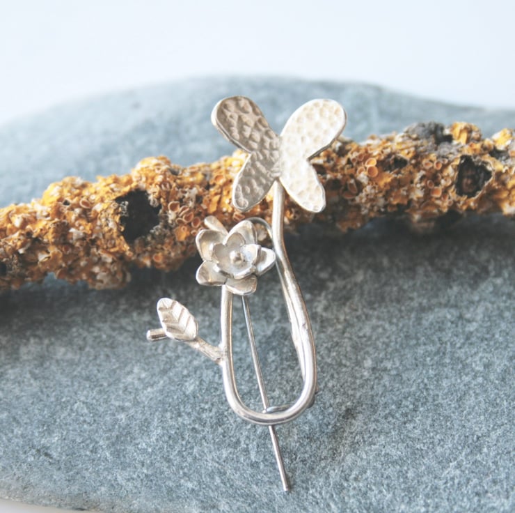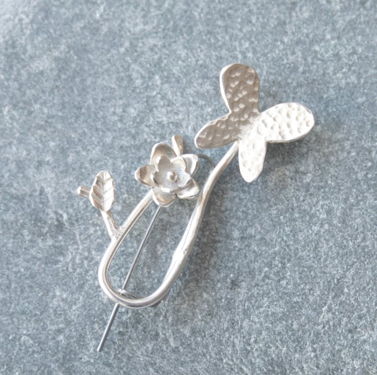 This brooch has a u-shape to it with a textured butterfly on one branch and a flower and a little leaf on the other. The silver flower has two layers to it, each one has five petals and there is a little ball soldered to the centre.