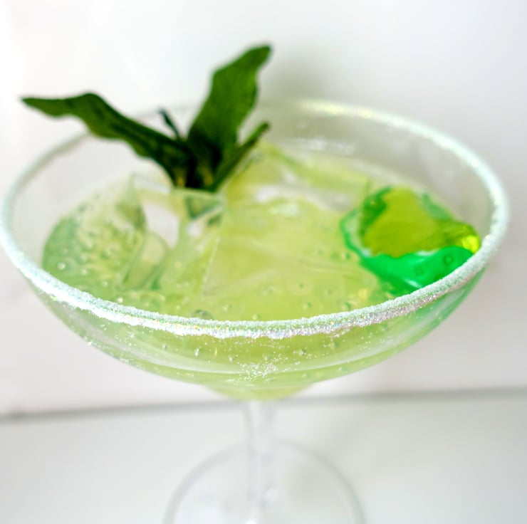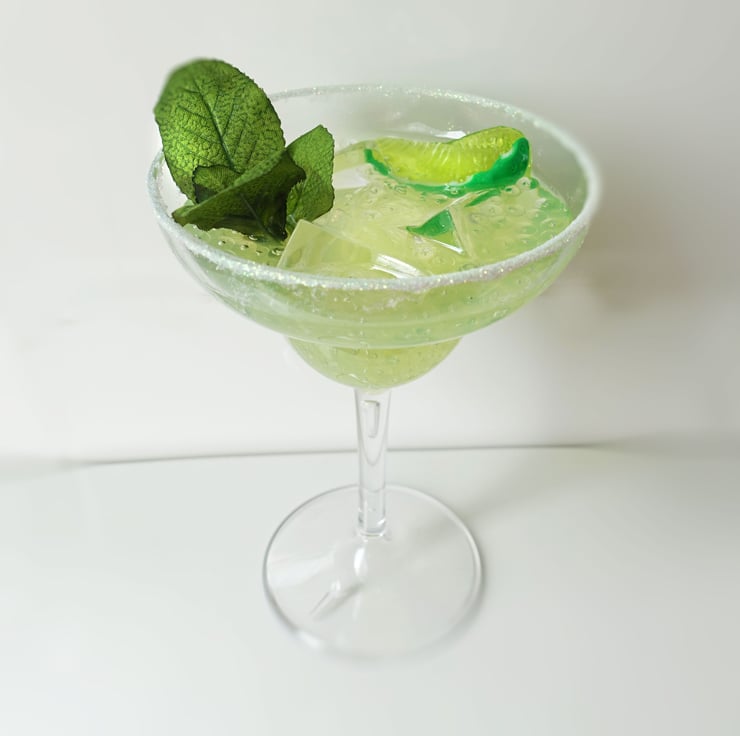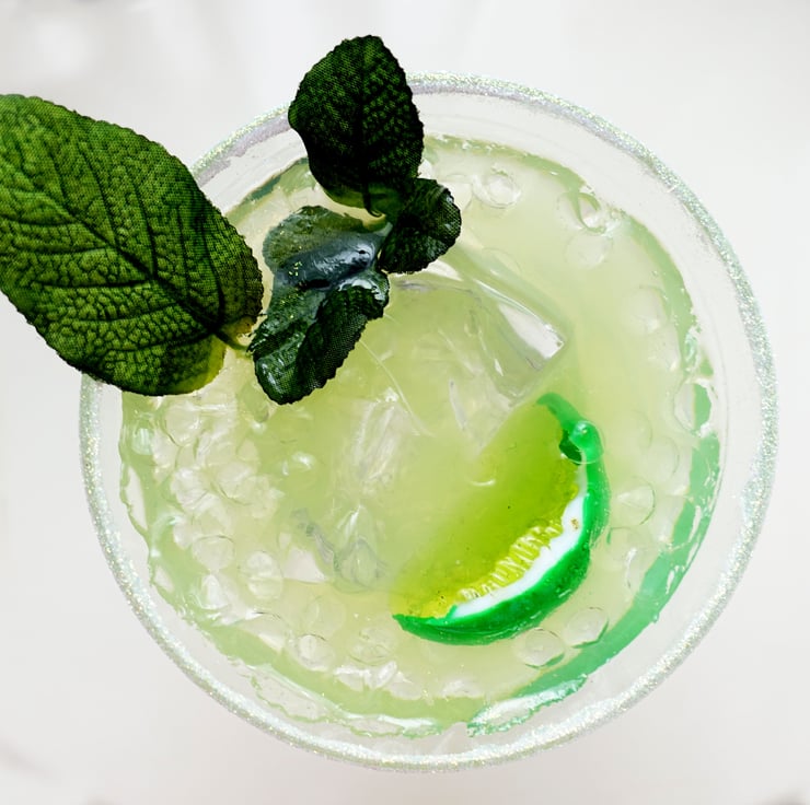 Highly realistic Margarita cocktail in lightweight tough polycarbonate glass. Made from resin with fake mint sprig, pink fake Himalayan salt with glitter accents and crushed ice.