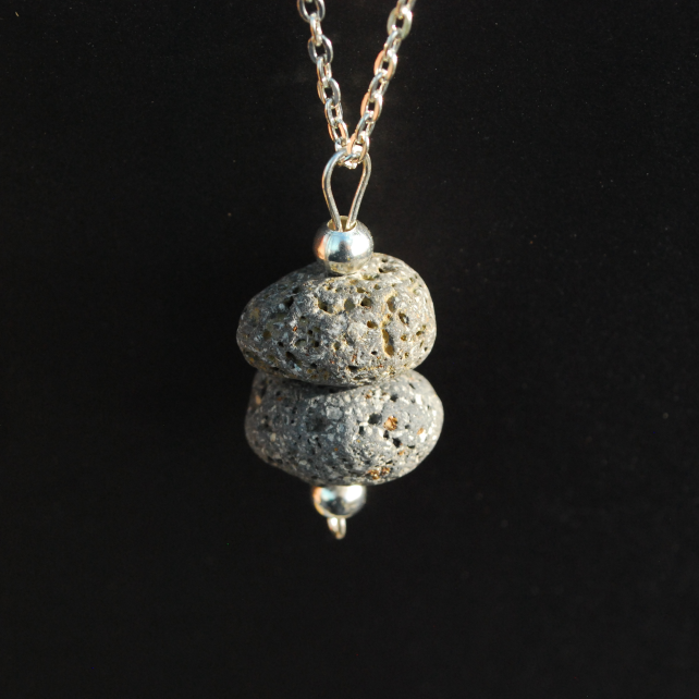 Volcanic rock is interesting because of its structure and colours. These two perfectly matched pebbles are typically full of bubbles and these have deep yellow in them. The pebbles are speckled with light grey particles, so we think they have been formed from compressed volcanic ash. The rest of the pendant is silver plated metal.