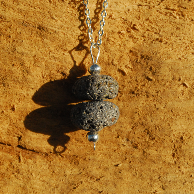Volcanic rock is interesting because of its structure and colours. These two perfectly matched pebbles are typically full of bubbles and these have deep yellow in them. The pebbles are speckled with light grey particles, so we think they have been formed from compressed volcanic ash. The rest of the pendant is silver plated metal.