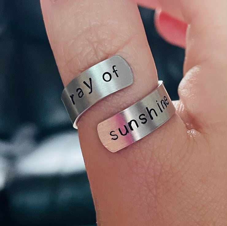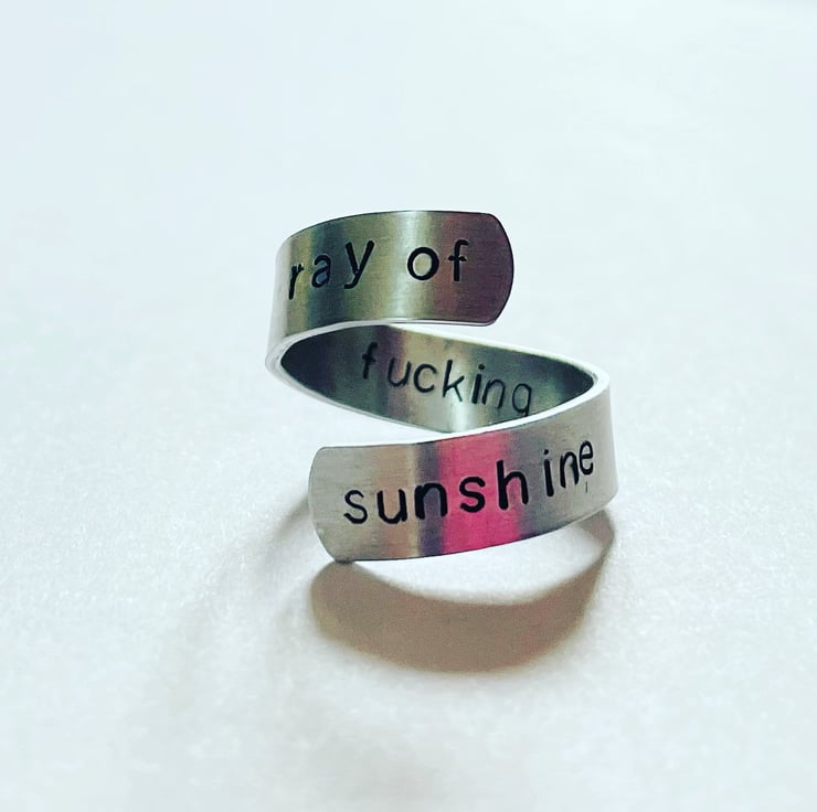 Aluminium adjustable wrap ring stamped with ‘ray of fucking sunshine’