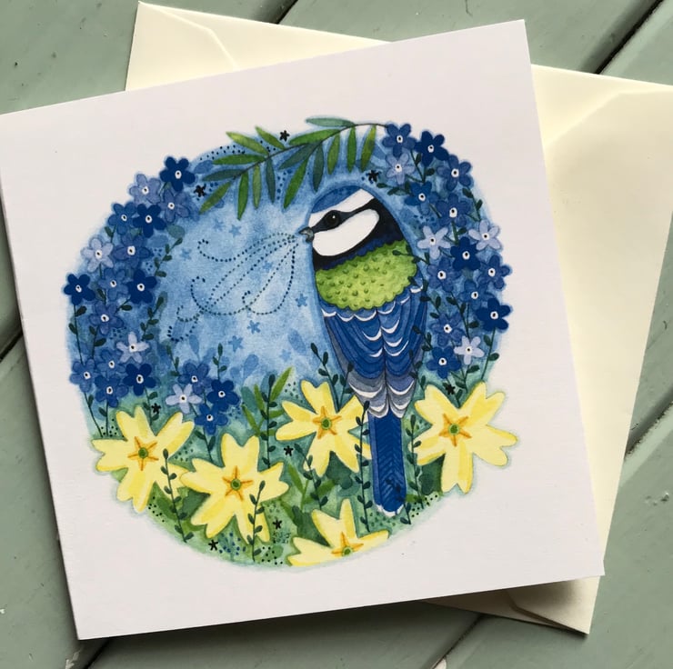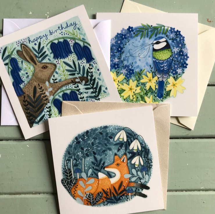 It seems everyone has a birthday in March, including me! So here’s a trio of cards for Spring birthday, featuring snowdrops and fox, hare and bluebells, blue tit and primroses. Each card measures 125mm square and comes with three envelopes: white, ivory pearlescent and cream. Blank inside.