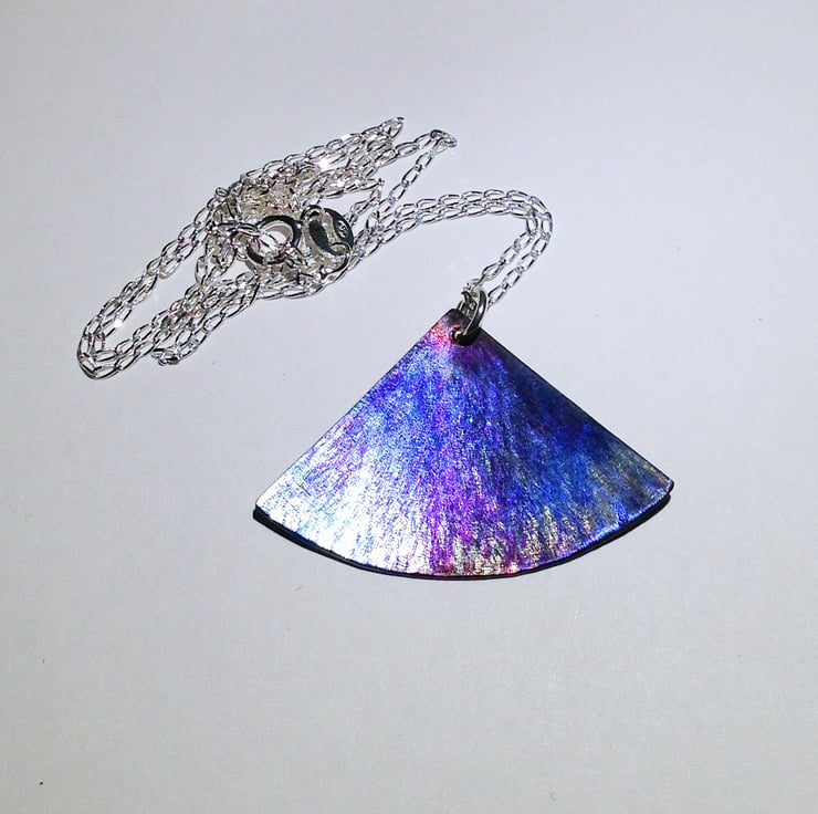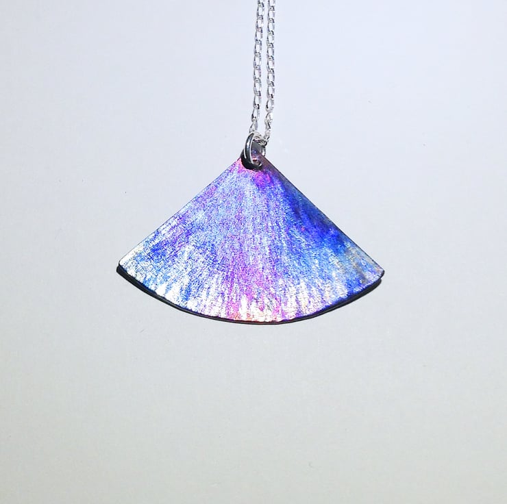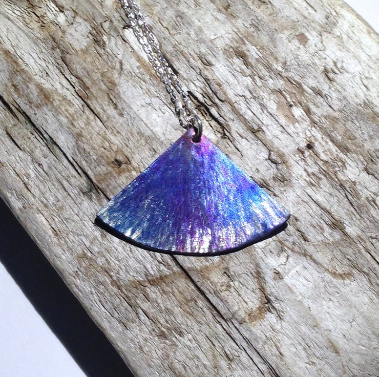 This beautiful pendant reminds me of a flower petal and I have made it by hand sawing the shape from titanium sheet then hammering it to create an interesting texture. I have then slightly domed it to create shape before colouring..