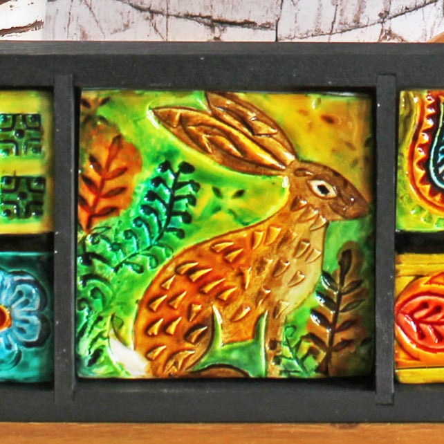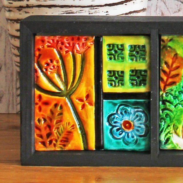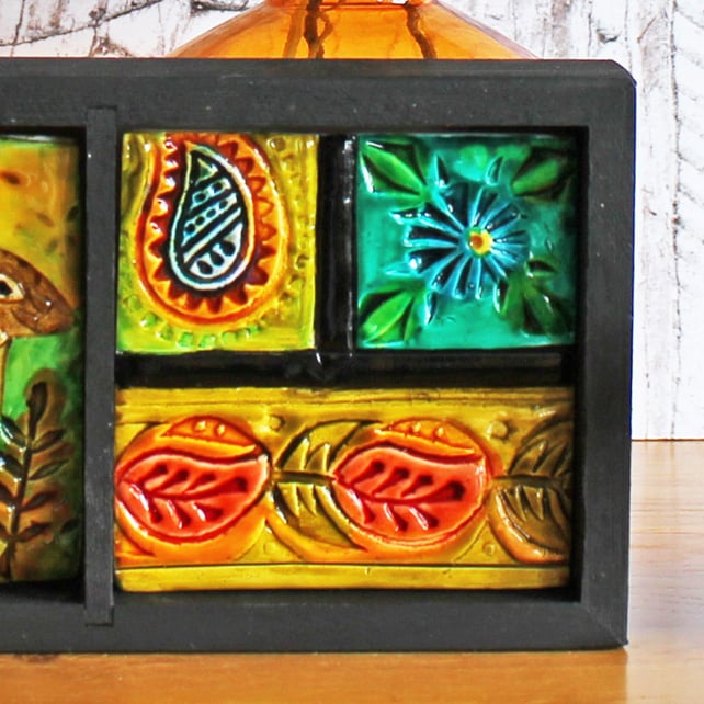 The artwork is housed in a small wooden box which has been painted with black acrylic paint. I've made three polymer clay tiles to fit in the compartments. The tiles have been debossed with a range of patterns and then layers of glass paints have been used to add colour and lustre.