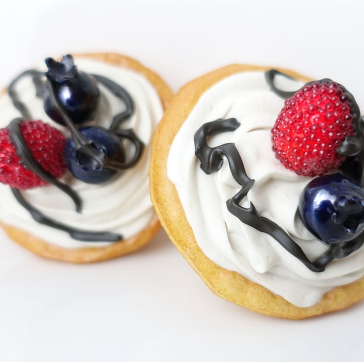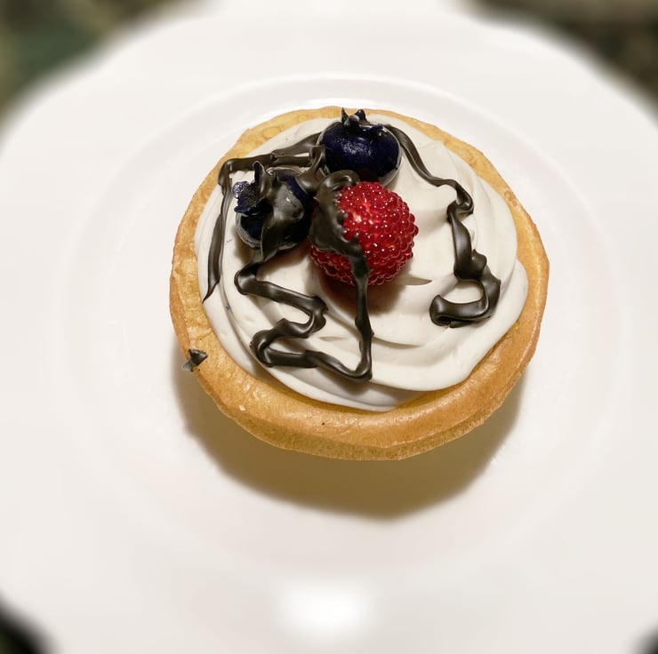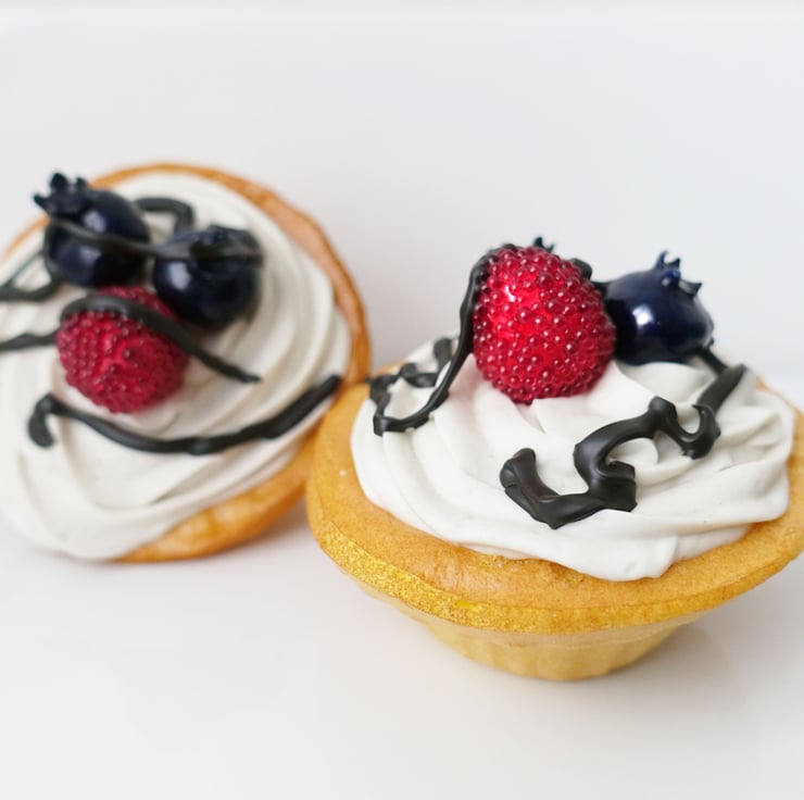One highly realistic fake blueberry and raspberry whipped cream tart, drizzled with fake chocolate sauce. Strictly adults only. Calorie Free, eaten only with the eyes.
