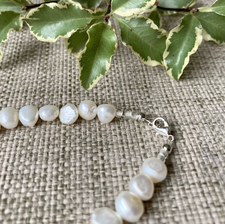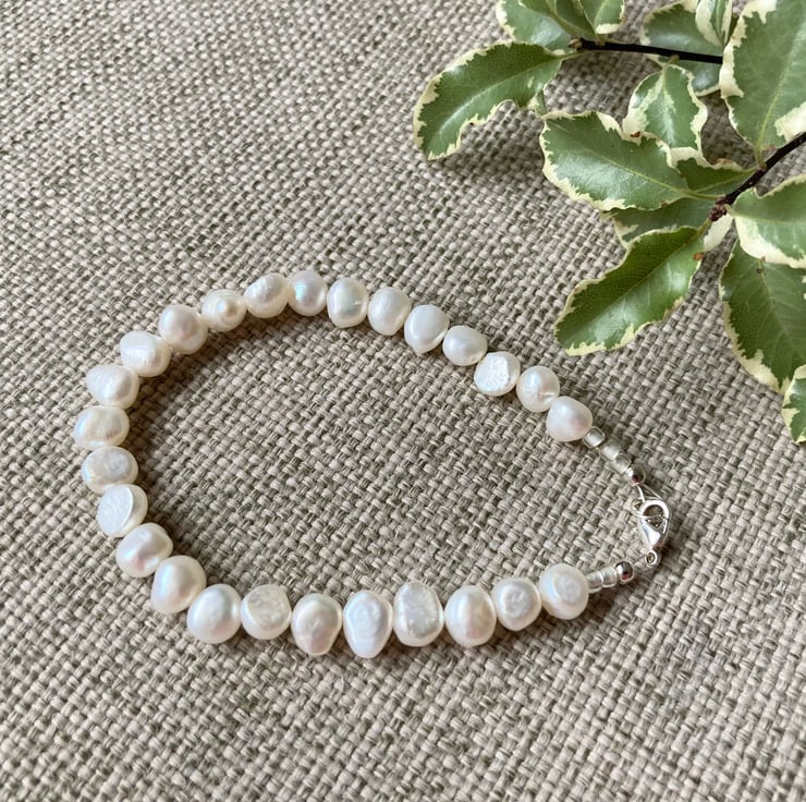 A lovely classic bracelet made with ivory freshwater pearls. The pearls are irregular in shape and approximately 6mm in diameter. The bracelet is approximately 19cm long with a silver-plated lobster clasp. Perfect for a bride, bridesmaid or a gift for Mother's Day, Birthday or Anniversary.