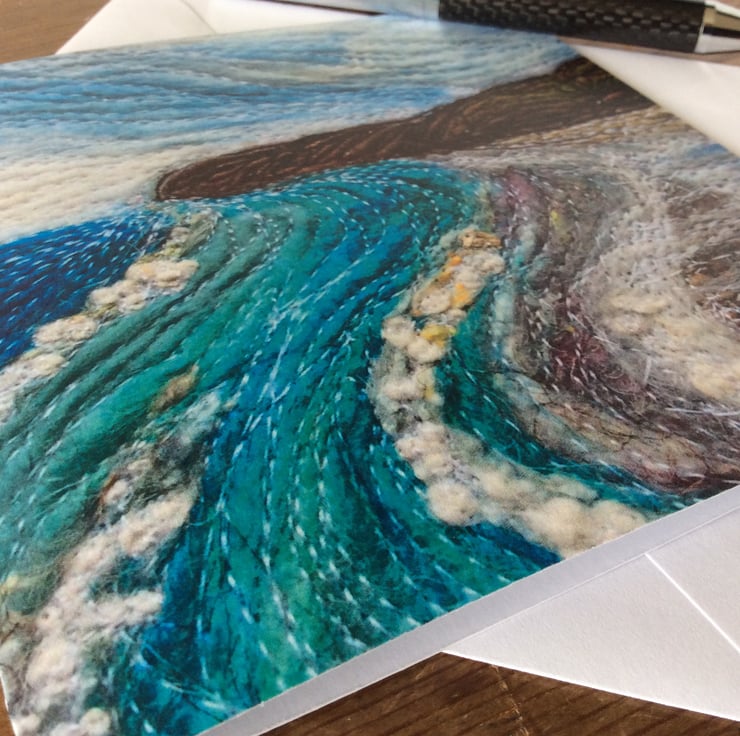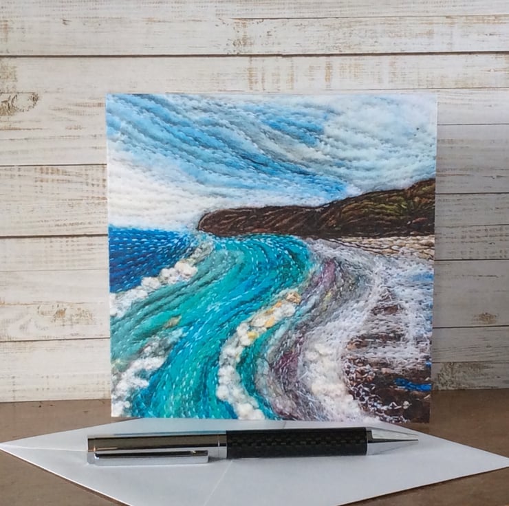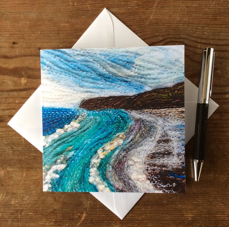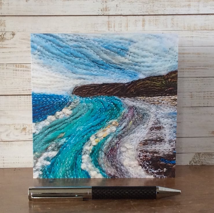 This card is a print of one of my free motion embroidered needle felted seascapes of Yorkshire. It shows Sandsend beach looking towards Whitby with the sea coming in. . It’s blank inside making it ideal for any occasion. The card measures 14.5 x 14.5cm and it comes with an envelop in a plastic cover for protection.