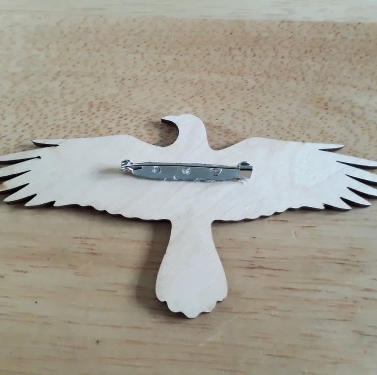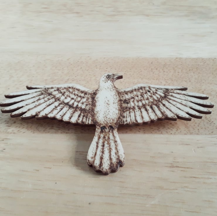 Wooden brooch of a crow decorated using pyrography (wood burning).