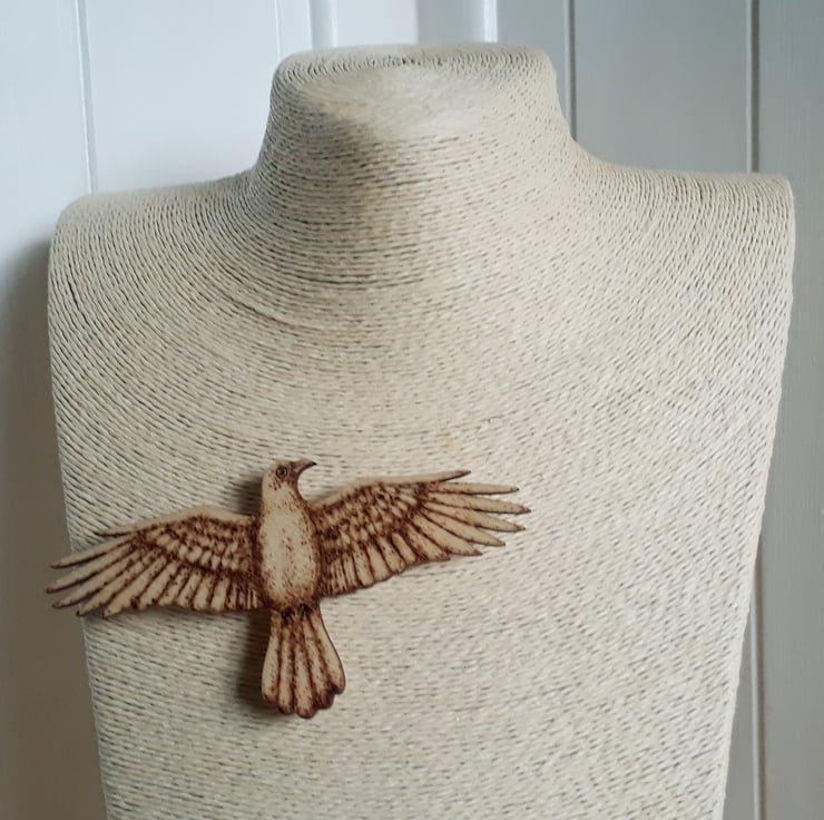 Wooden brooch of a crow decorated using pyrography (wood burning).