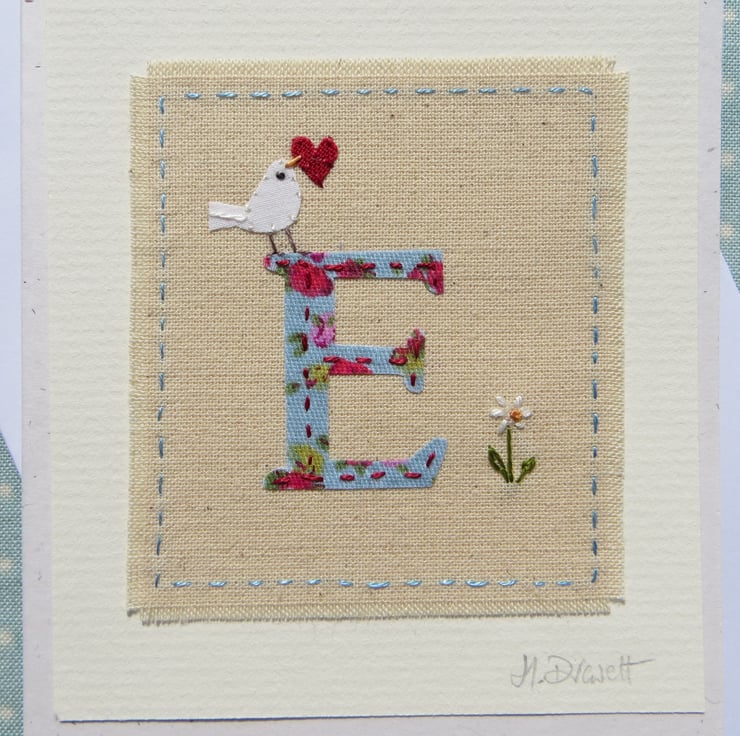 A small hand-stitched textile mounted onto a card with the letter 'E' cut from pretty blue floral fabric stitched into place with tiny stitches. I have added a miniature applique dove with heart in her beak, and then embroidered a tiny daisy flower to complete the design.