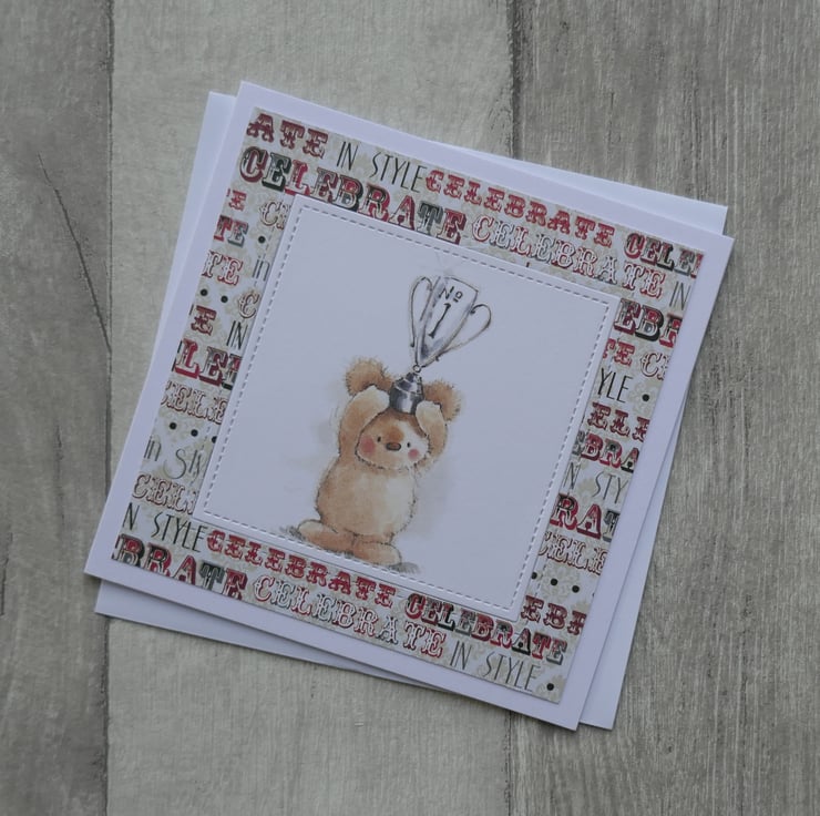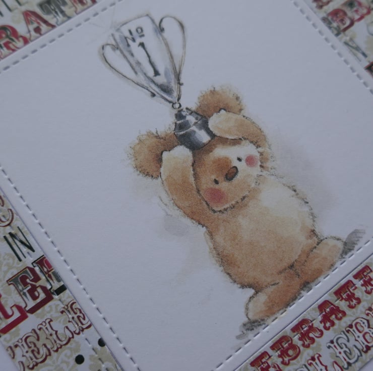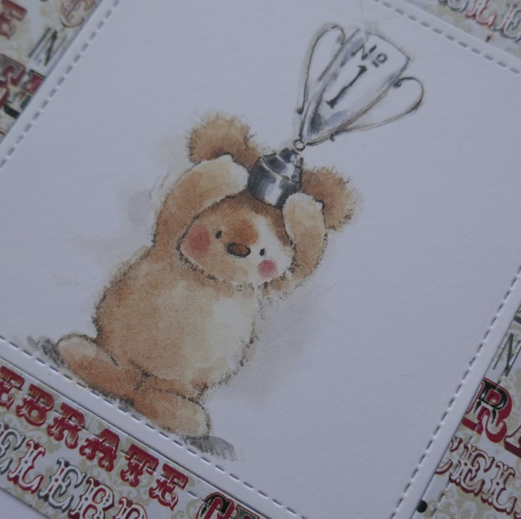 A piece of 'Celebrate in Style' patterned paper has been attached to the front of the card leaving a white border around the edge and a stitched square in the centre. A cute Lili of the Valley precoloured image of a bear holding a trophy has been inlaid into the frame.