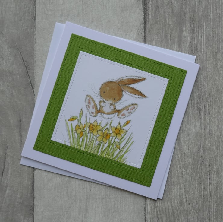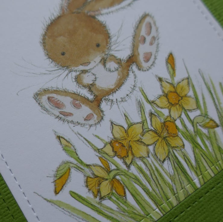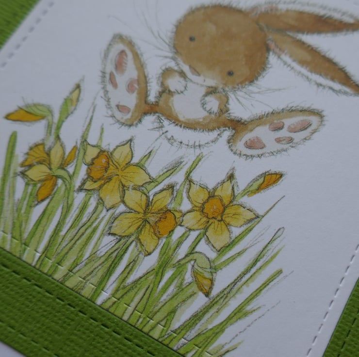 The cute Lili of the Valley precoloured image of a bunny jumping over daffodils has been die cut into a stitched square which is inlaid into a bright green stitched frame. '