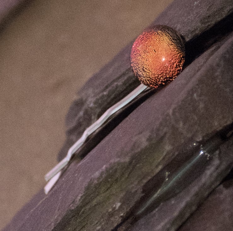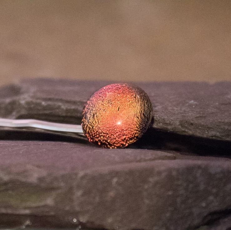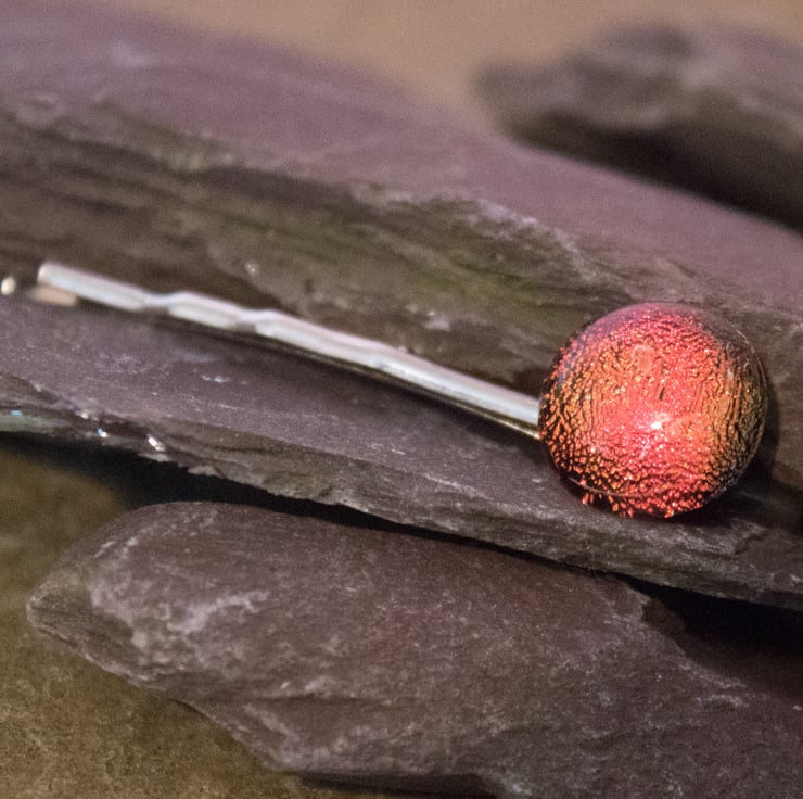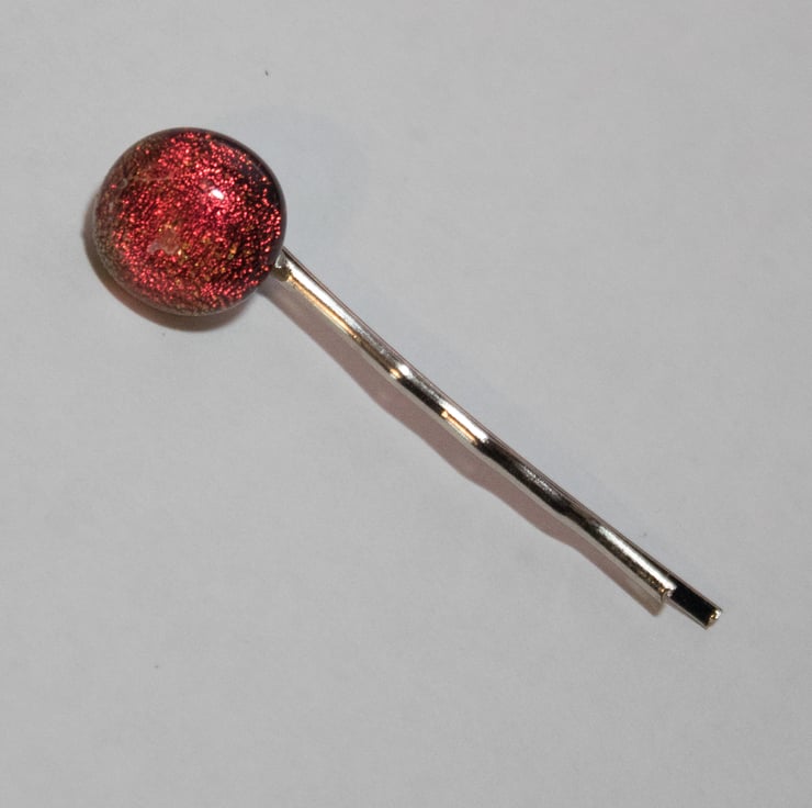 It is made from a glass dot that is approximately 0.8 cm in diameter mounted on a silver-coloured metal bobby pin. This listing is for a Red glass dot, but other colours are available in the shop.