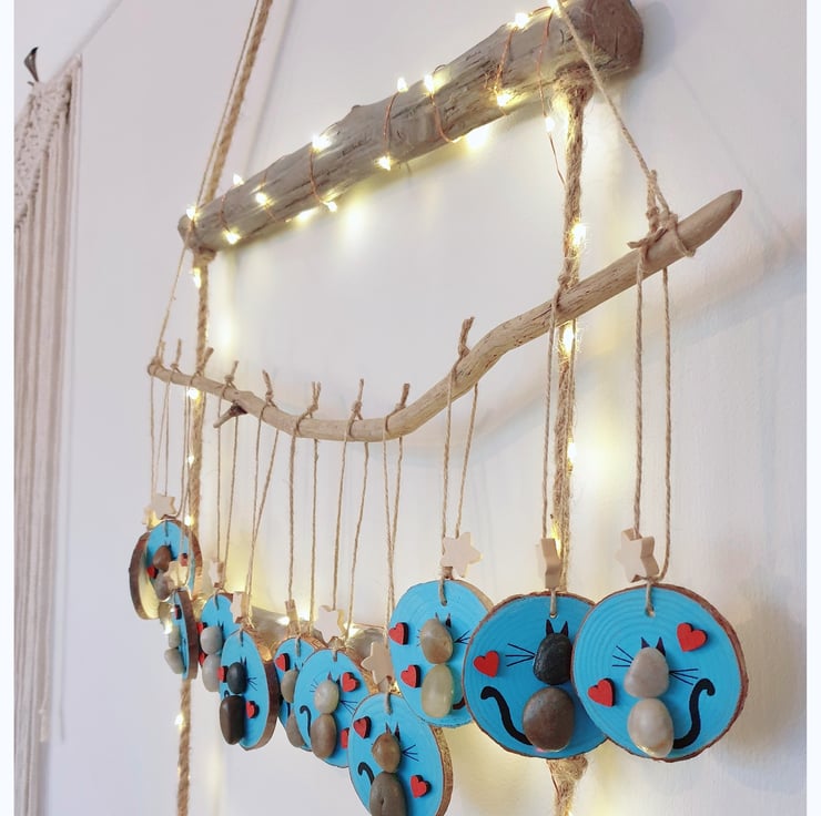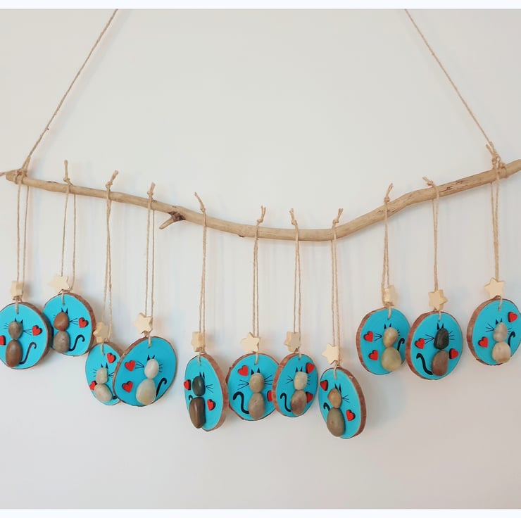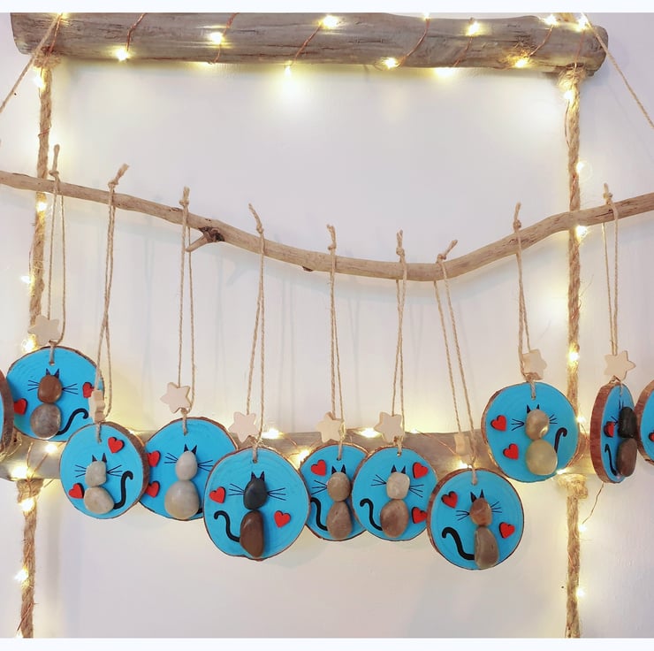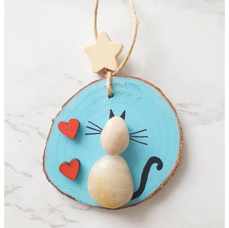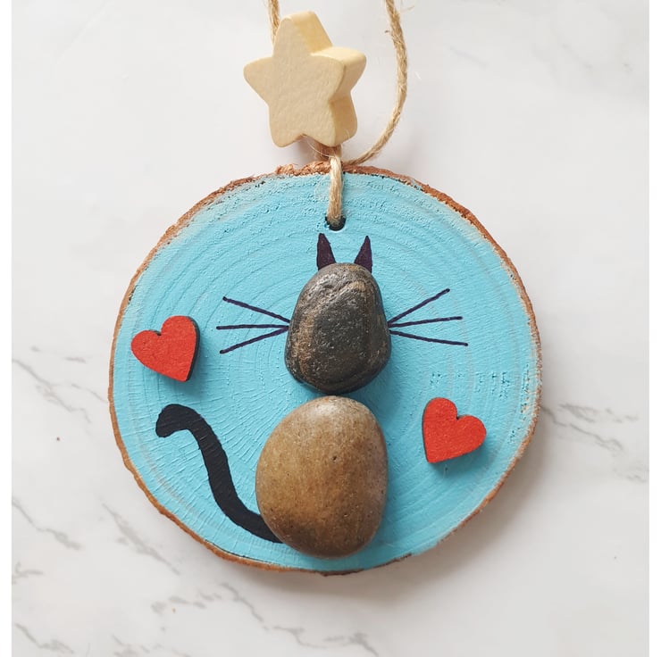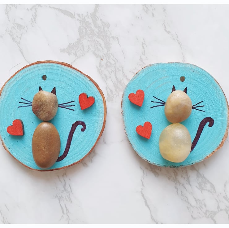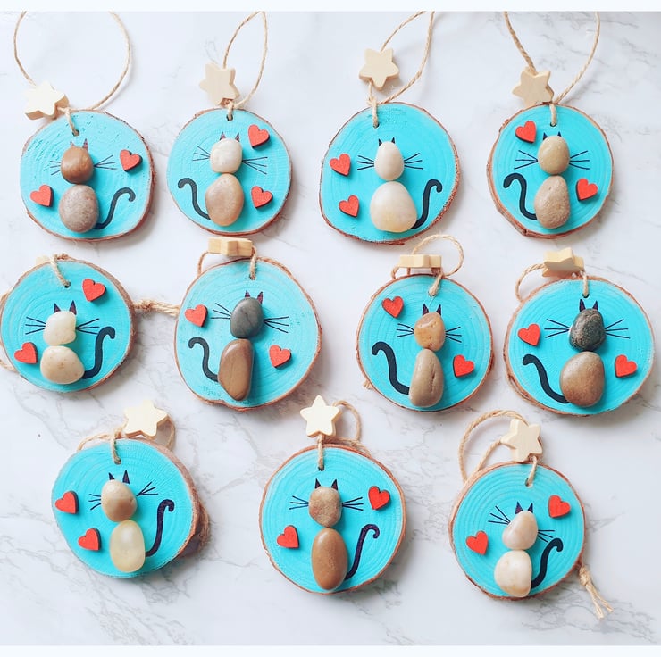 The wood slices have been painted with acrylic paint and sealed lightly with varnish. The cats are created with pebbles from my beachcombing finds. I also added two red wooden hearts and a star to each ornament. The wood slices measures appropriately 6cm -7cm. Please note that you'll be given a random ornament.