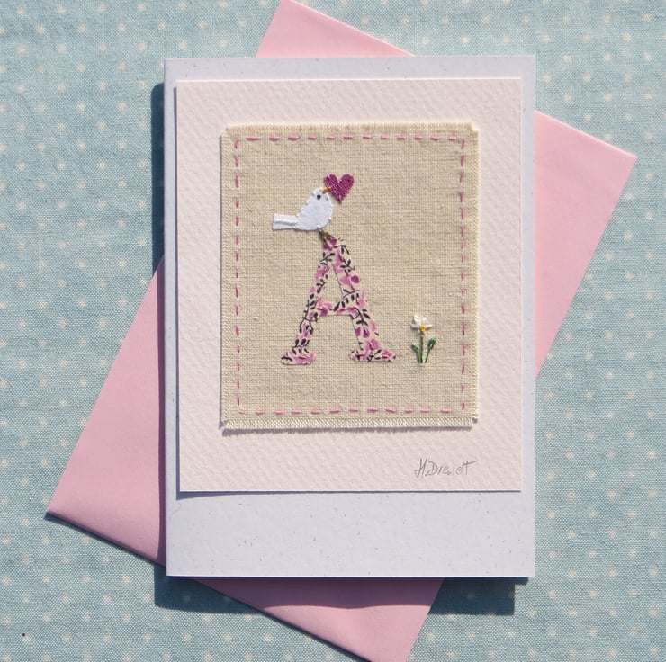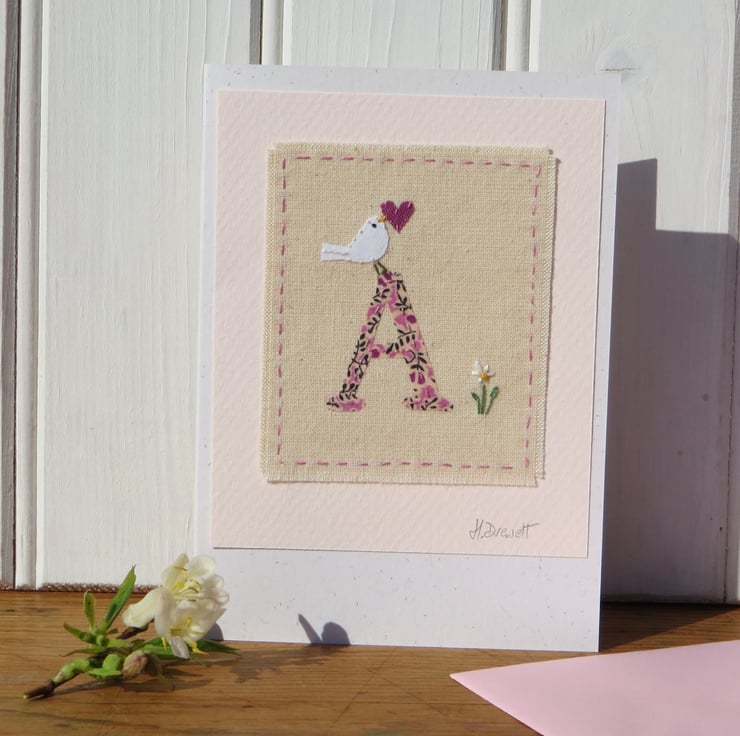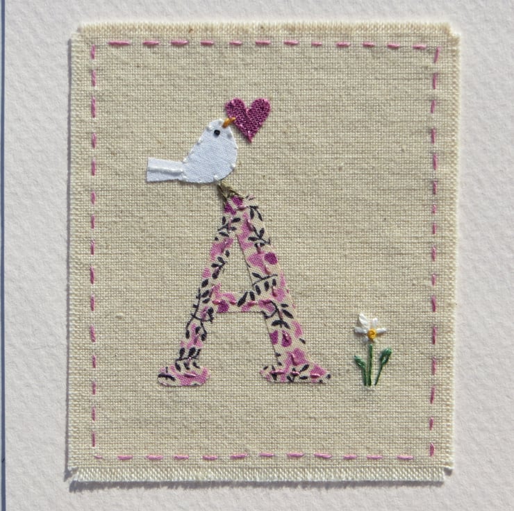 A small hand-stitched textile mounted onto a card with the letter 'A' cut from pretty floral fabric stitched into place with tiny stitches. I have added a miniature applique dove with heart in her beak, and then embroidered a tiny daisy flower to complete the design.A