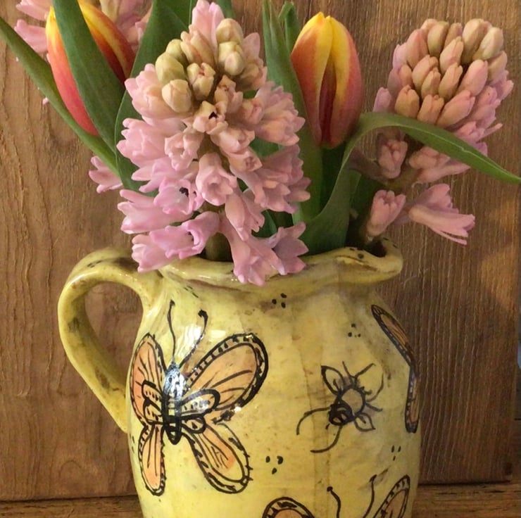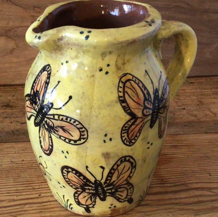 Hand made earthenware jug. Hand decorated in underglaze colour with butterfly design.