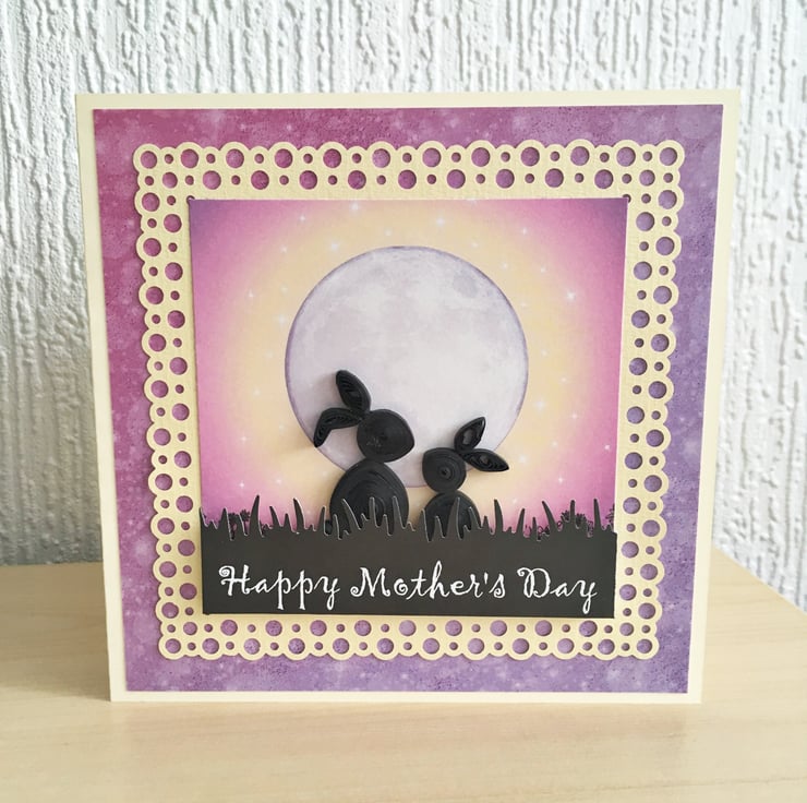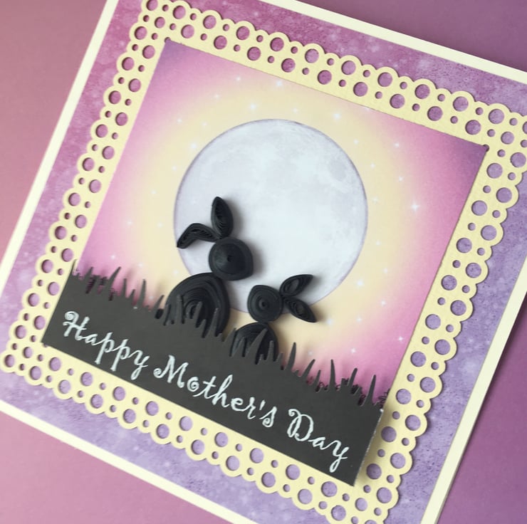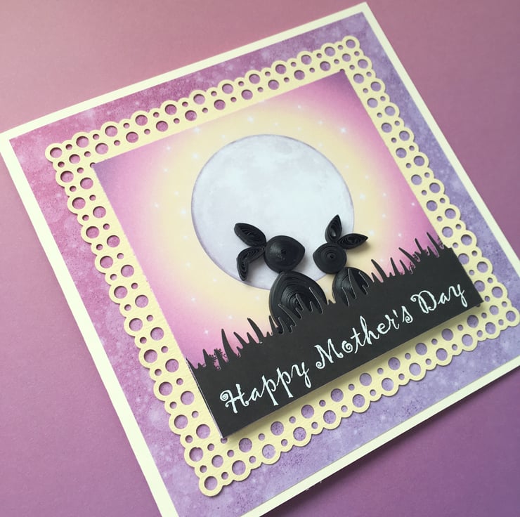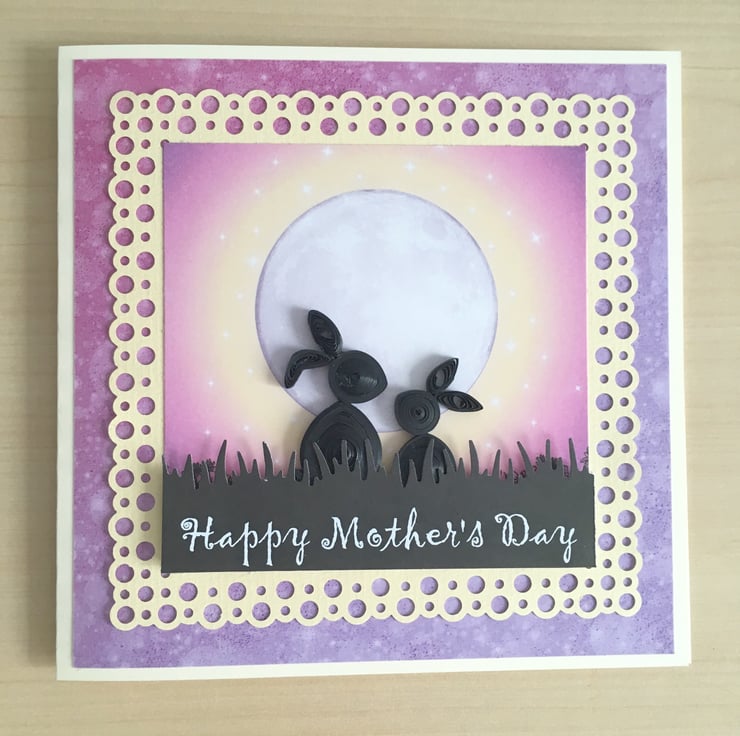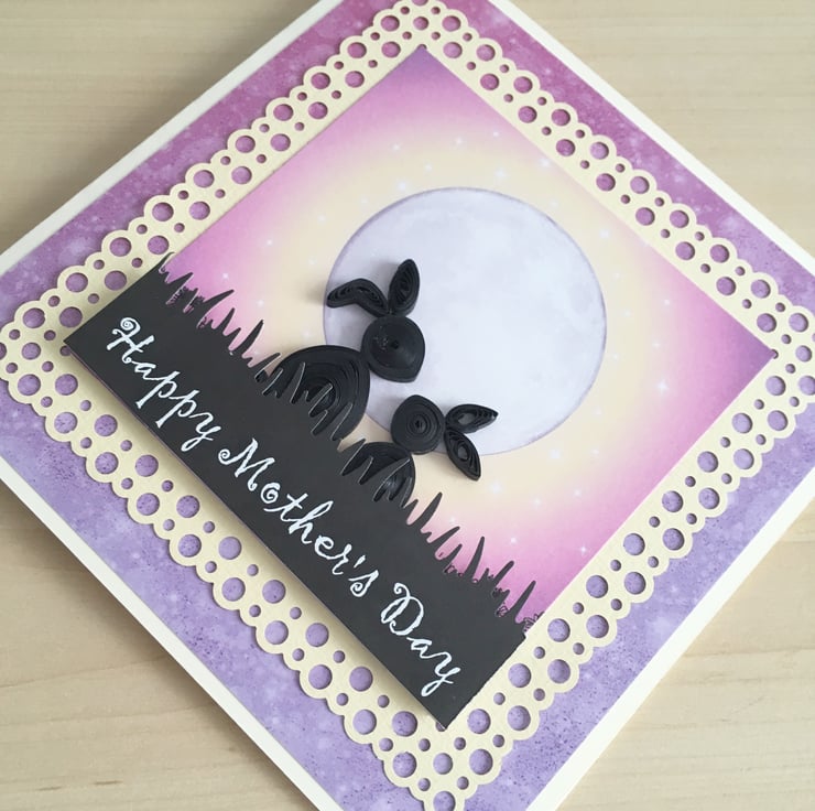 This card features a quilled mother rabbit with her rabbit-child who is gazing up at her in the woods during a beautiful sunset. After all, a mum is a beautiful sight to a child.